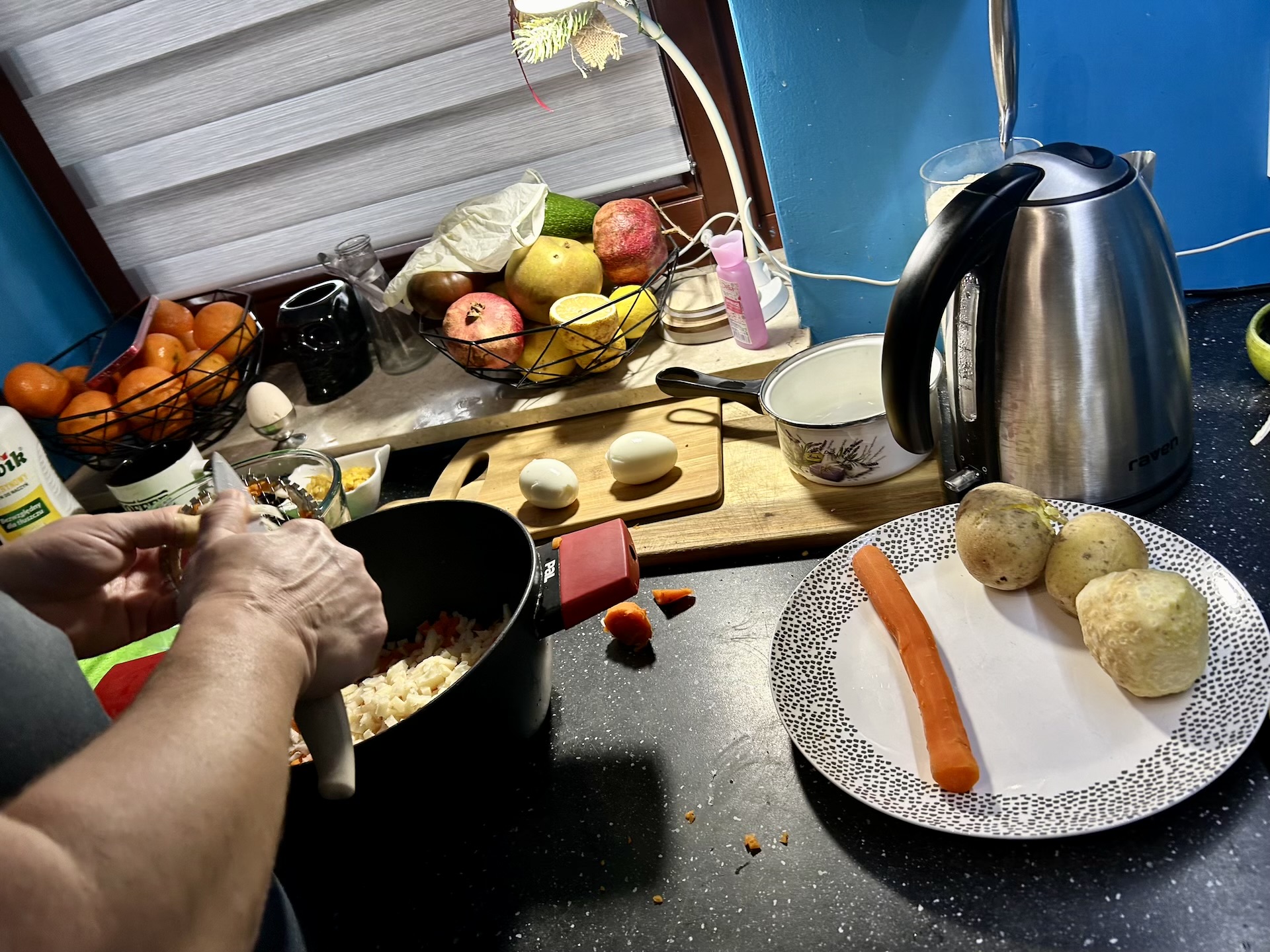 Gotowanie warzyw: Marchew, pietruszkę i seler obierz i ugotuj do miękkości w lekko osolonej wodzie lub bulionie (Sugeruję jednak bulion dla lepszego smaku). W osobnym garnku ugotuj ziemniaki w mundurkach. Po ugotowaniu odstaw warzywa do lekkiego przestygnięcia.