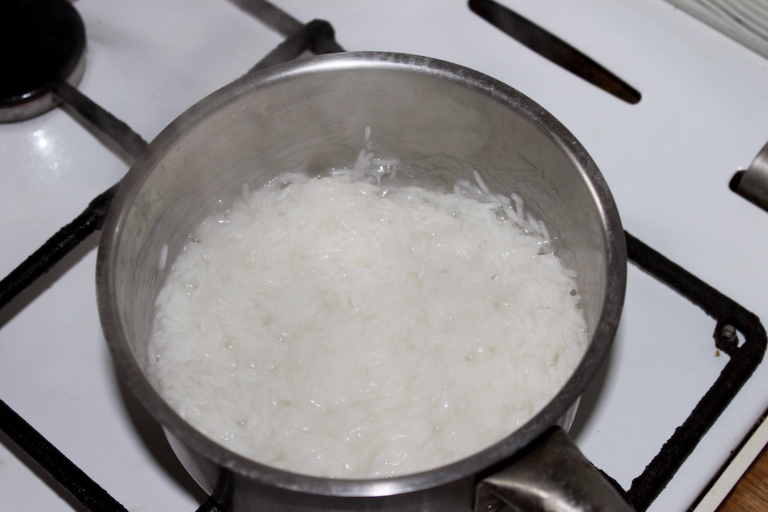 Ugotuj 100 gramów ryżu basmati zgodnie ze wskazówkami na opakowaniu. Odstaw ryż, aby przestygł.