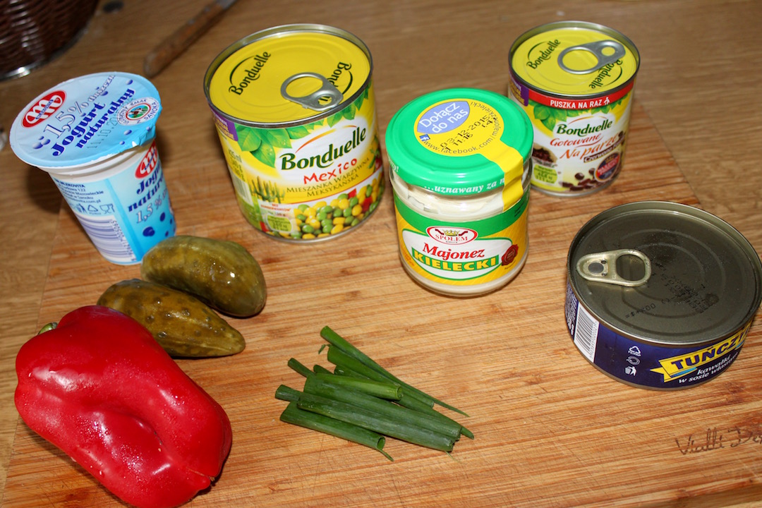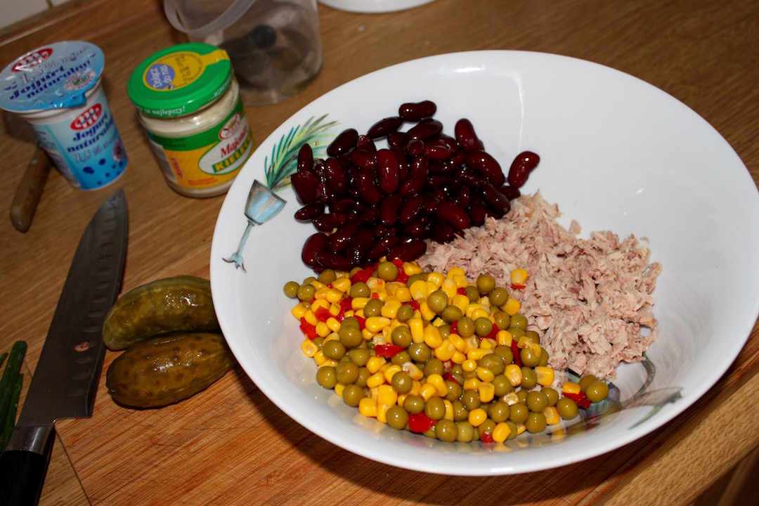 Warzywa z puszki i fasolkę kidney opłucz dobrze pod bieżącą wodą i odcedź przed przełożeniem do miski. Dodaj je do tuńczyka.