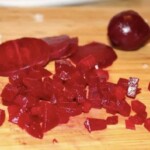 Upieczone buraki przestudź, obierz ze skóry i pokrój w drobną kostkę.