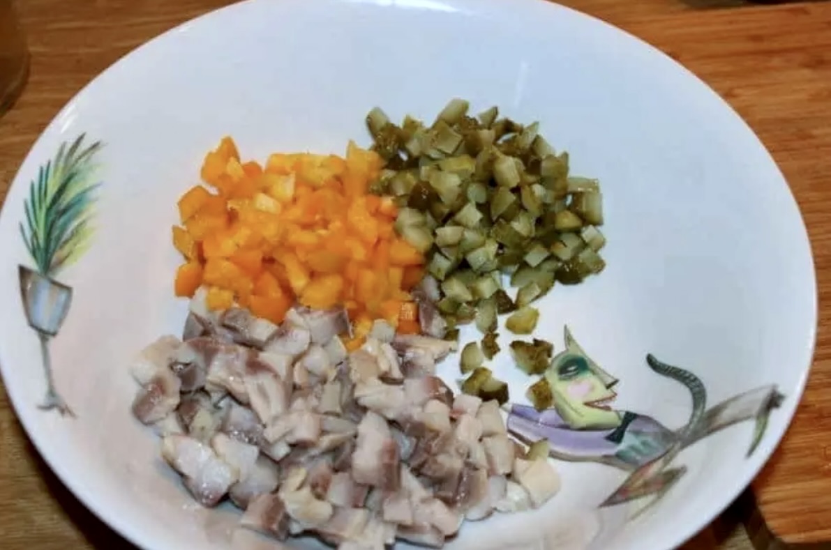 Osusz śledzie i pokrój je w drobną kosteczkę.