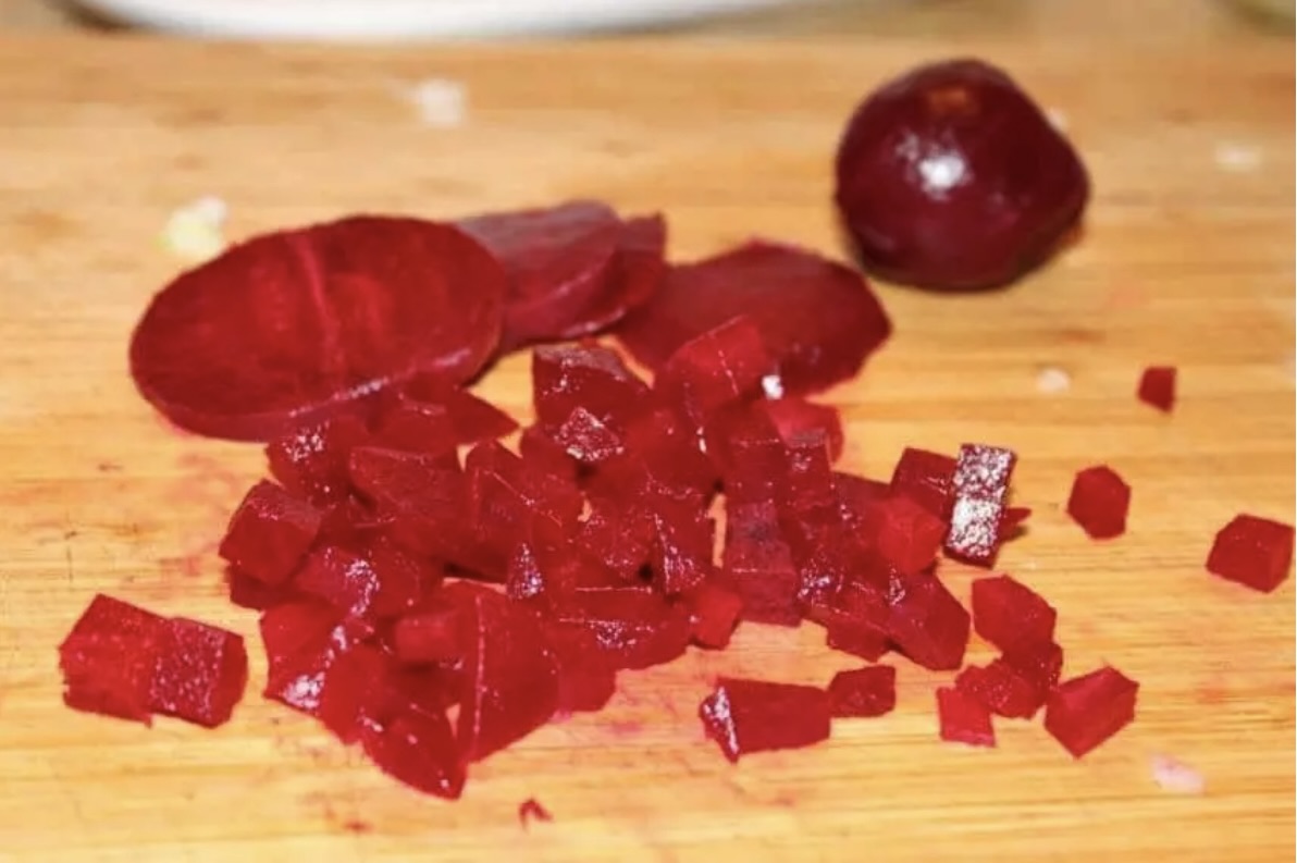 Upieczone buraki przestudź, obierz ze skóry i pokrój w drobną kostkę.