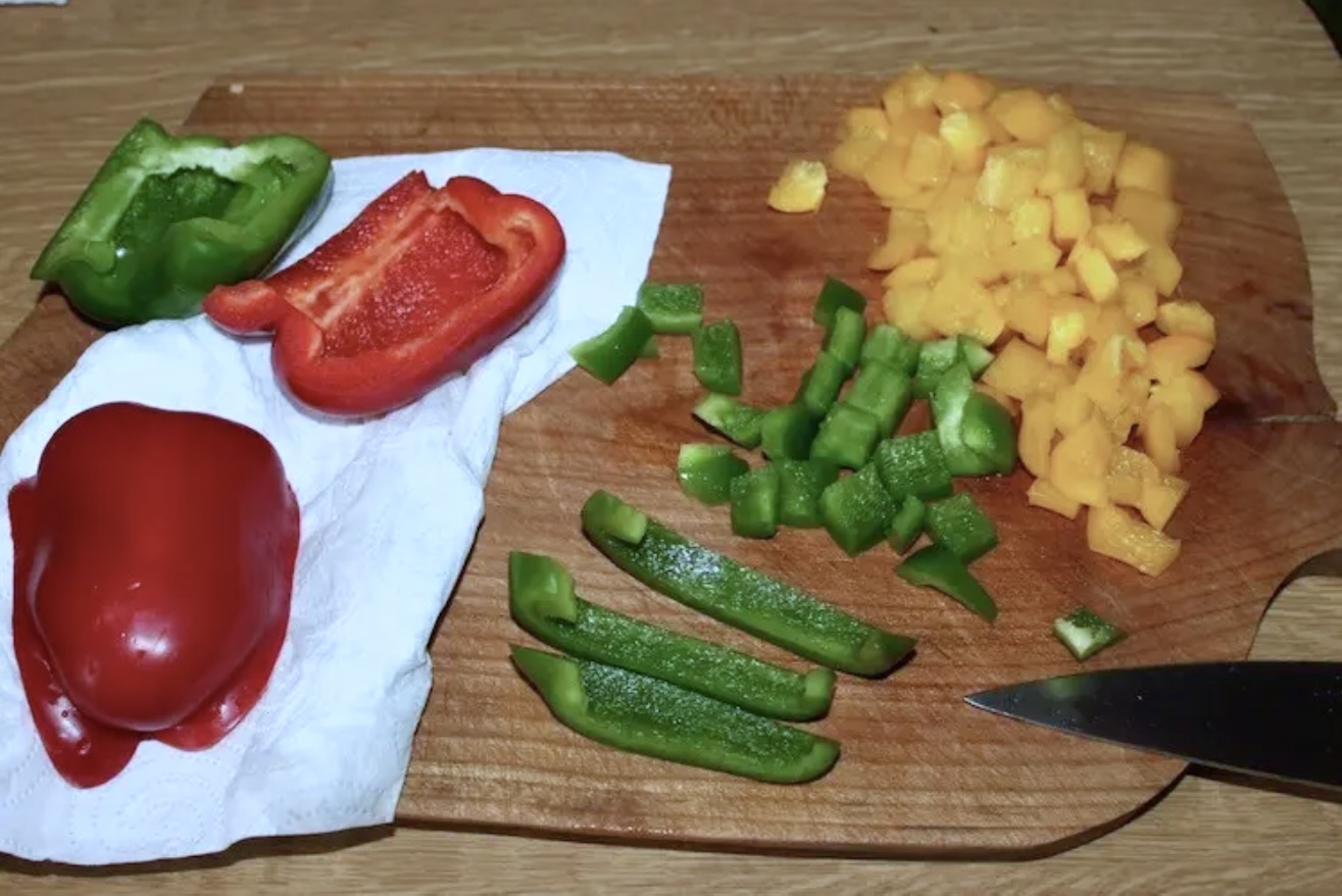Przygotowanie warzyw: Papryki pozbaw gniazd nasiennych i białych błonek, umyj, a następnie osusz. Pokrój w drobną kostkę.