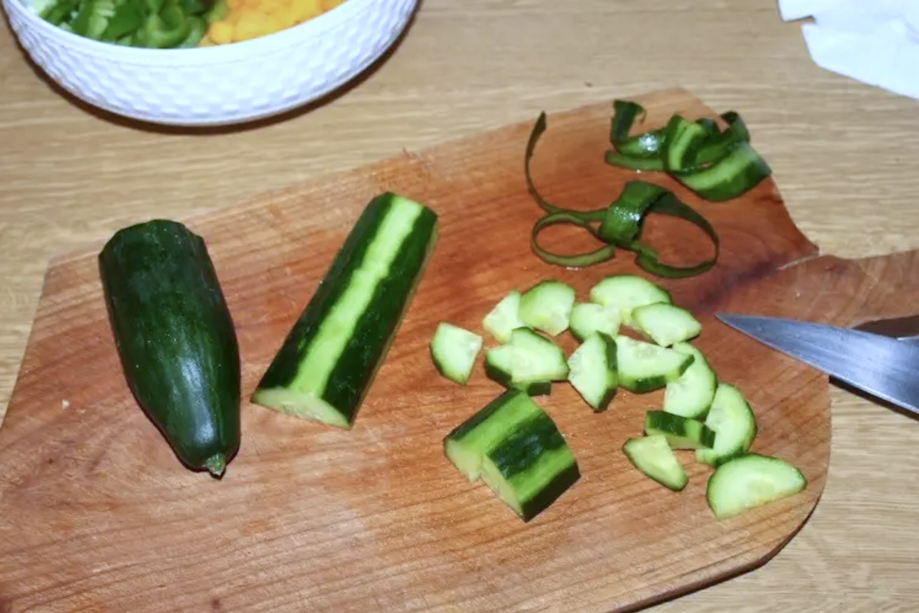 Ogórek: Umyj i osusz. Częściowo obierz ze skórki, a następnie pokrój w półplasterki.