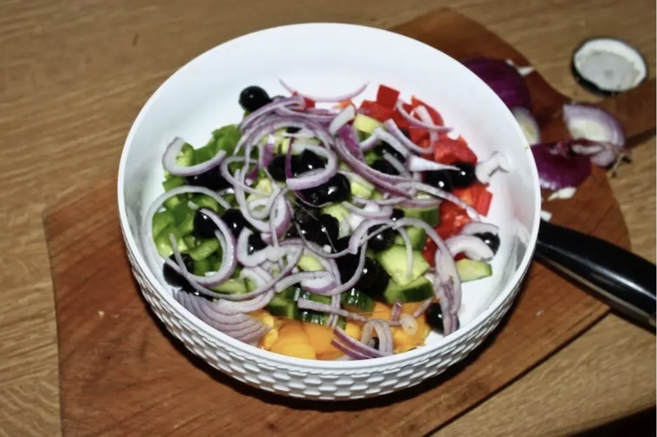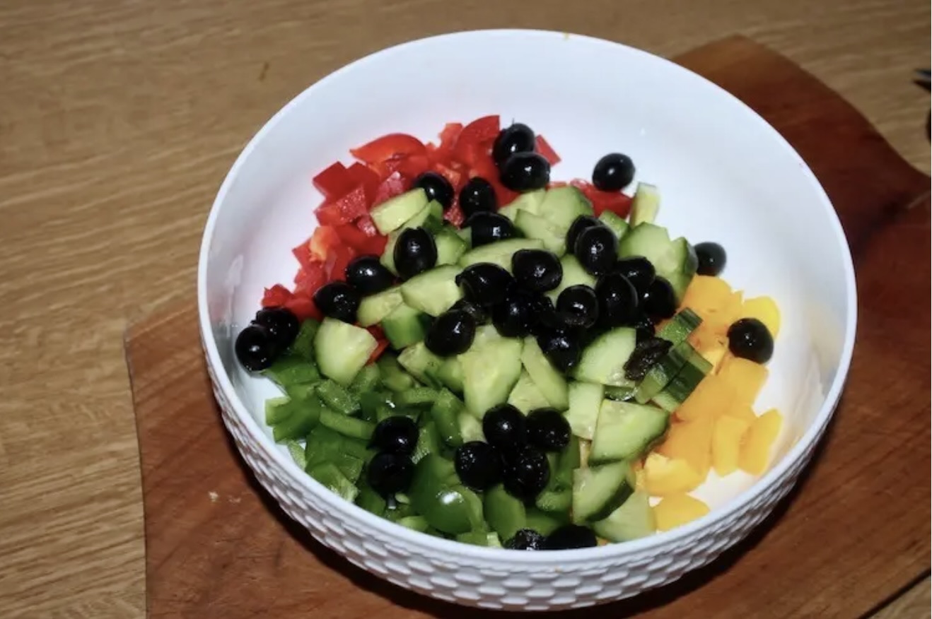 Połączenie składników: Wszystkie pokrojone warzywa i oliwki umieść w dużej misce.