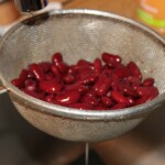 Odcedź z zalewy i przepłucz czerwoną fasolkę i groszek.