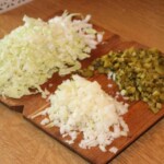 Przygotowanie warzyw: W międzyczasie posiekaj drobno kapustę pekińską. Dużą cebulę oraz ogórki konserwowe (lub korniszony) pokrój w drobną kostkę.