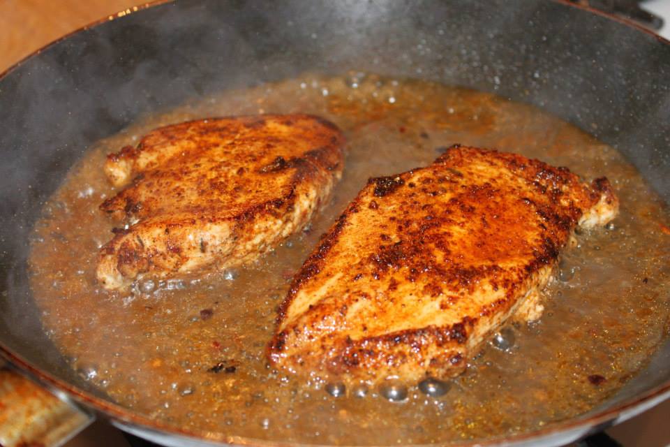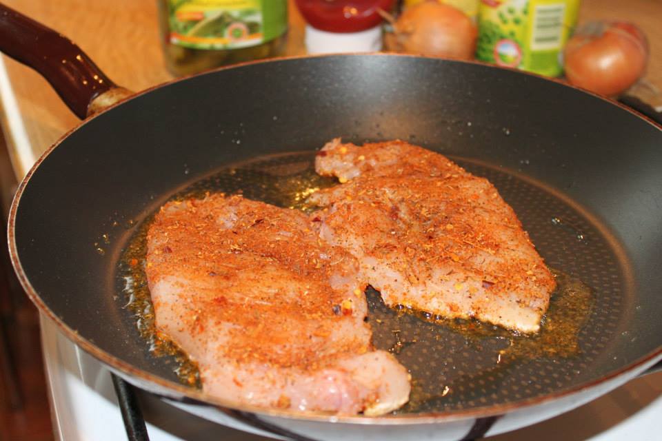 Przygotowanie kurczaka: Dwie spore piersi z kurczaka delikatnie rozbij na dość grube kotlety. Obficie posyp ulubionymi przyprawami.