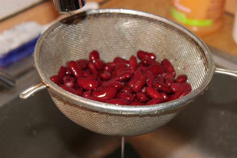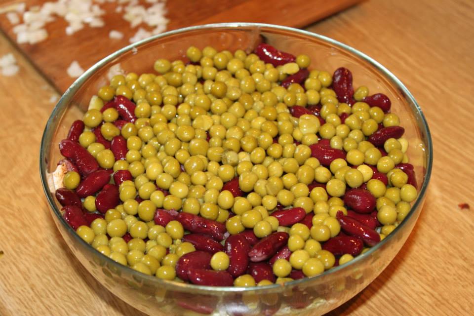 Odcedź z zalewy i przepłucz czerwoną fasolkę i groszek.