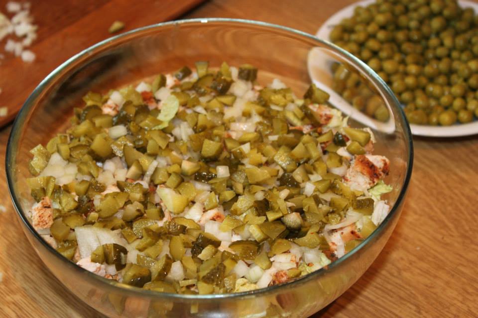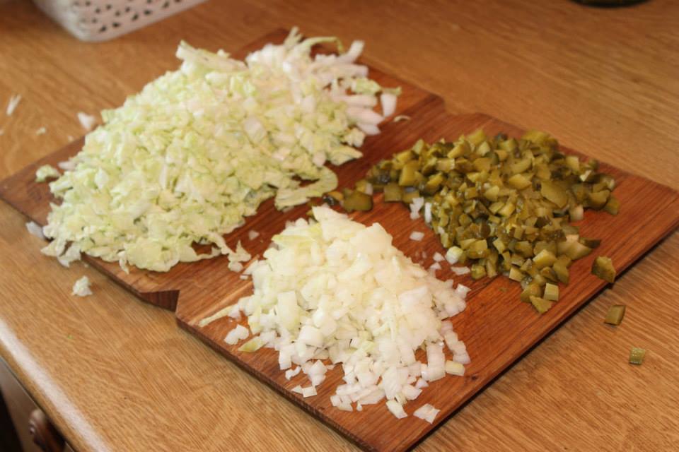 Przygotowanie warzyw: W międzyczasie posiekaj drobno kapustę pekińską. Dużą cebulę oraz ogórki konserwowe (lub korniszony) pokrój w drobną kostkę.