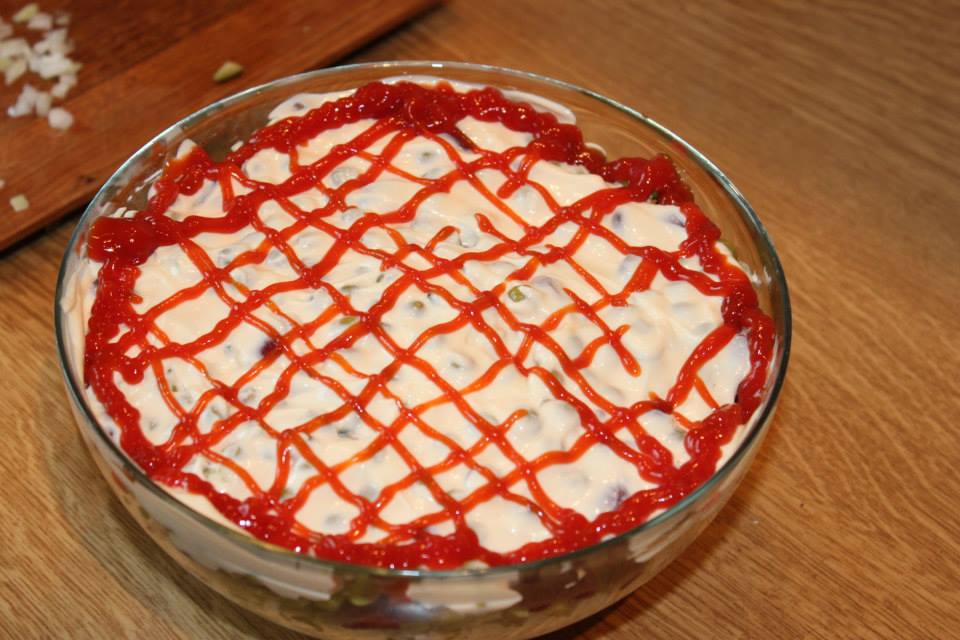 Wyrównaj warstwę i rozsmaruj na niej 2 łyżki majonezu, a na wierzch wyciśnij trochę pikantnego ketchupu.