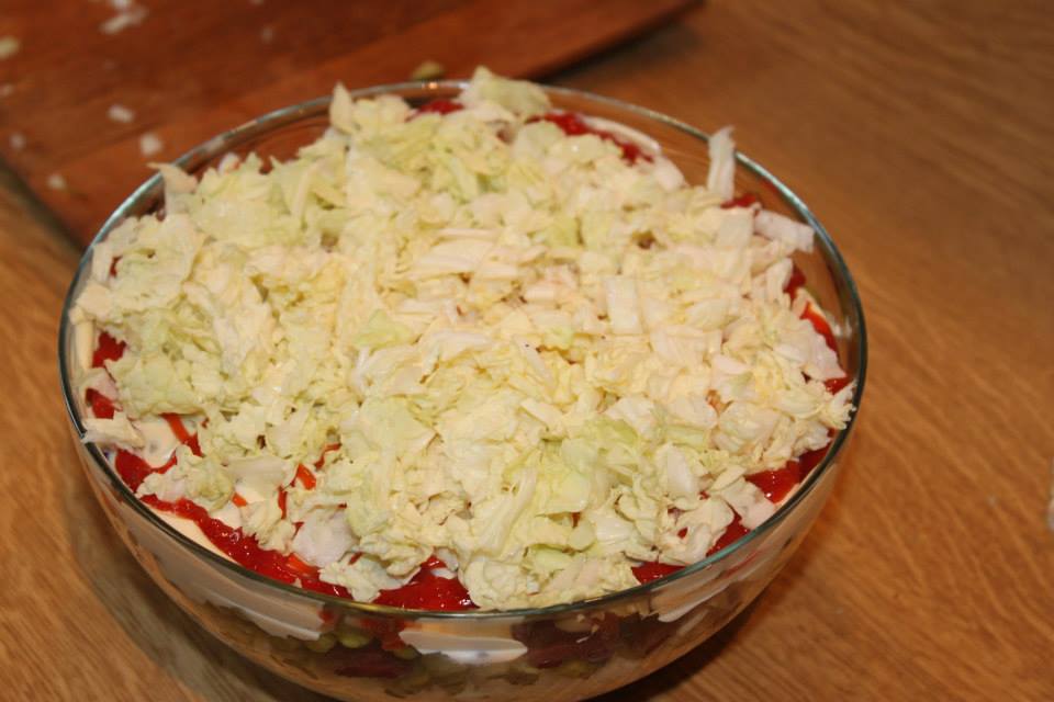 W ten sam sposób ułóż drugą warstwę. Sałatka najlepiej smakuje podana na zimno.
