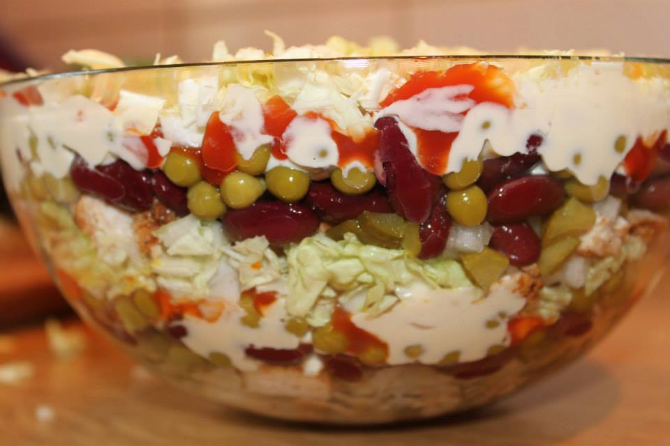 Sałatka warstwowa z kurczakiem to niby nic oryginalnego, ale za to rzecz sprawdzona i smakuje zawsze. Wystarczą piersi z kurczaka i warzywa z puszki, więc sałatkę robi się dość szybko. Oczywiście wszelkiego rodzaju zamiany, podmiany składników pod swoim kątem mile widziane. Piersi z kurczaka trzeba bardzo dobrze przyprawić, najlepiej jakąś ulubioną mieszanką przypraw lub kilkoma ulubionymi. Jeżeli zamierzasz użyć mieszanki przypraw sprawdź, czy czasem nie ma w składzie wzmacniaczy smaku.