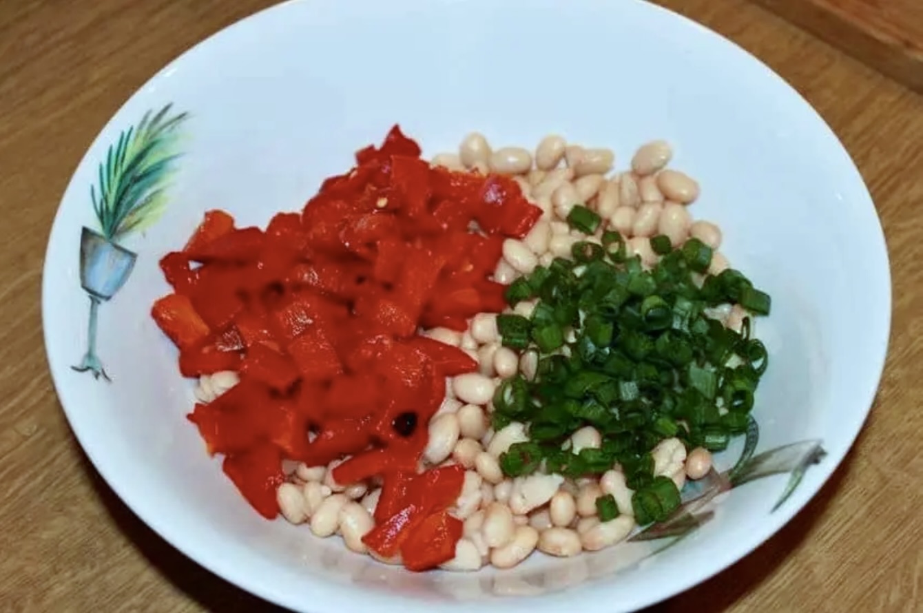 Grillowaną, marynowaną paprykę pokrój w drobną kostkę lub paski. Dodaj do fasolki.