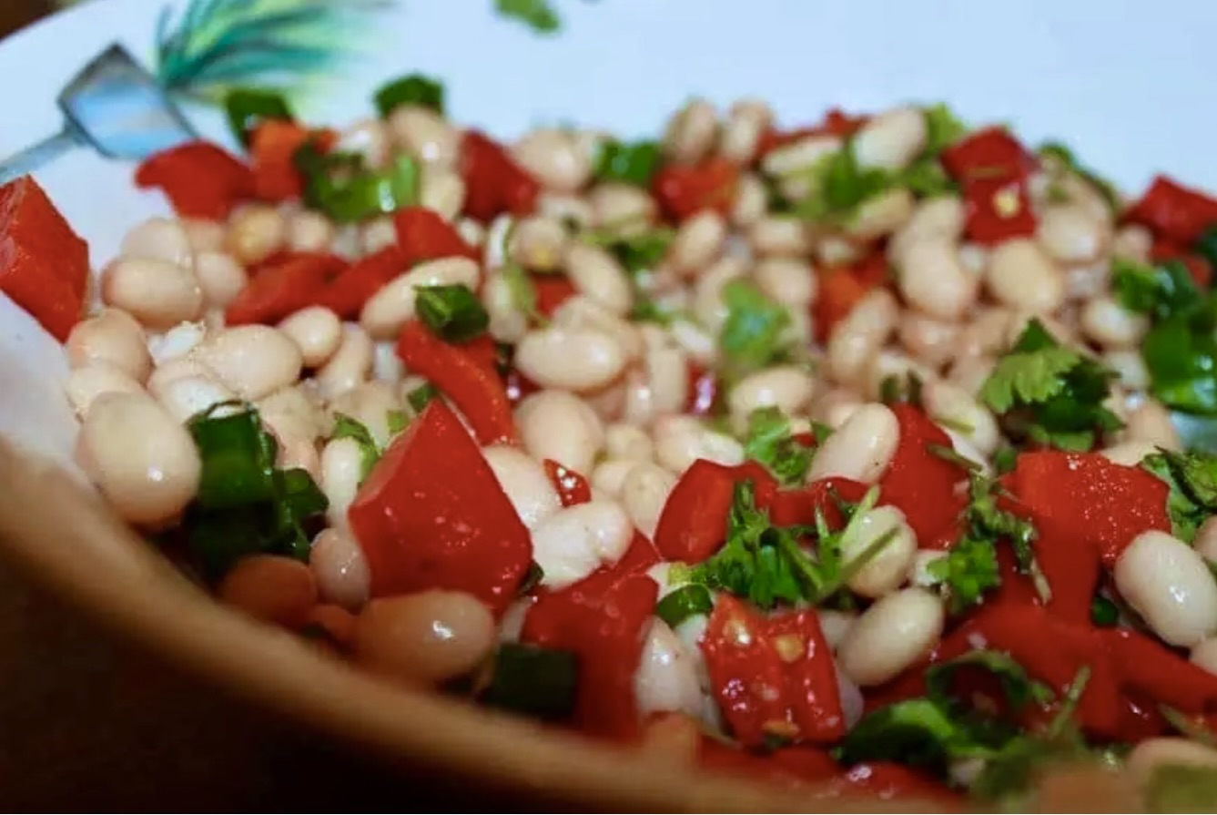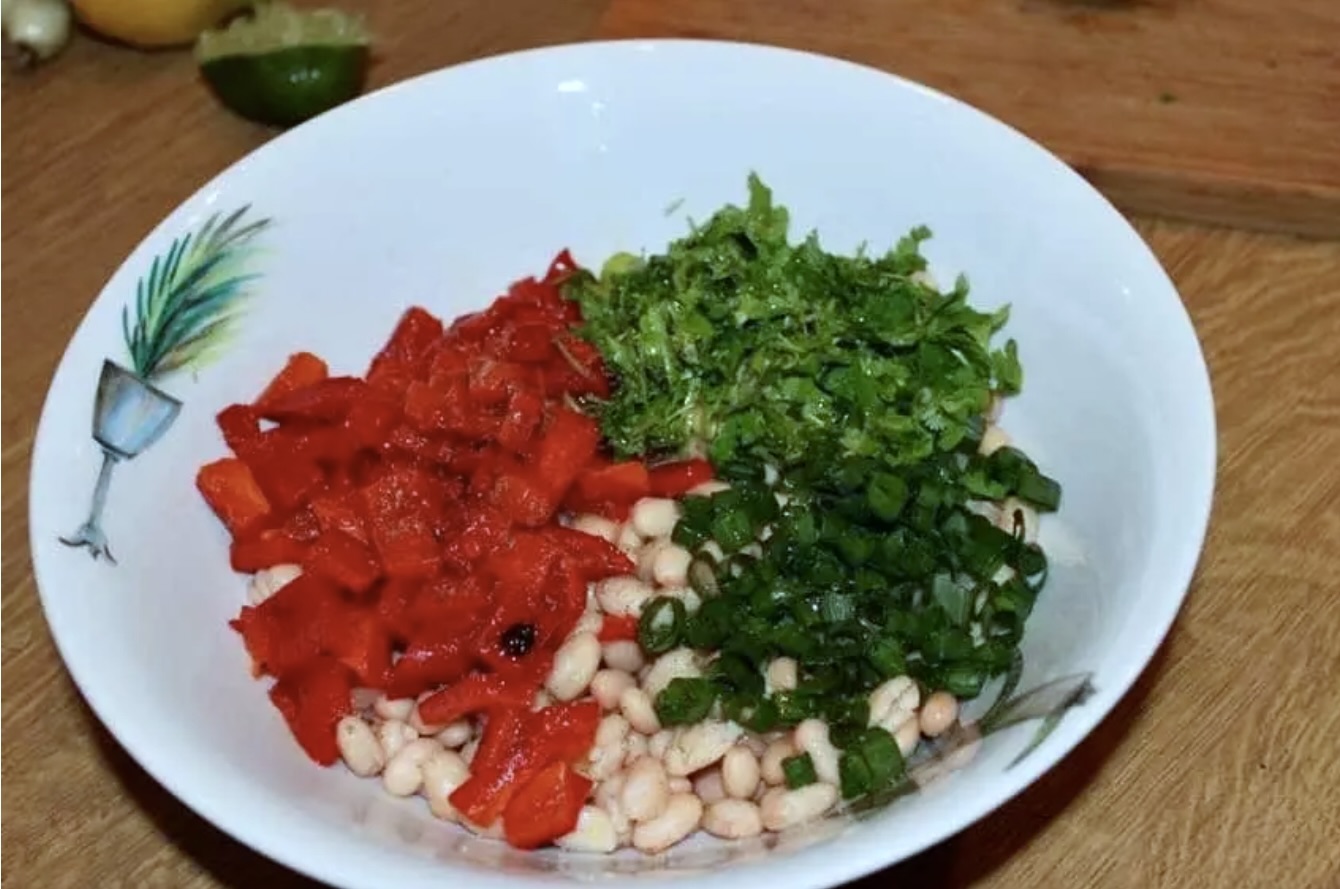 Sałatka z białej fasolki z dodatkiem marynowanej czerwonej papryki, świeżej kolendry i dymki skropiona oliwą i sokiem z cytryny. To bardzo prosta, ale ciekawa w smaku sałatka. Jej głównym składnikiem jest oczywiście drobna, biała fasolka. Użyłem takiej z puszki ze względu na ograniczony czas. Jeżeli wolisz możesz oczywiście użyć świeżej fasolki, namoczonej uprzednio przez noc i gotowanej. Jeżeli użyjesz tej z puszki przygotowanie tej sałatki zajmie Ci nie więcej niż 10 minut. Moja sałatka z białej fasolki świetnie nadaje się jako dodatek do obiadu, ale i jako samodzielna potrawa. Najczęściej serwuję ją do falafeli, ale raz na czas jadam z przyjemnością np. na lunch.
