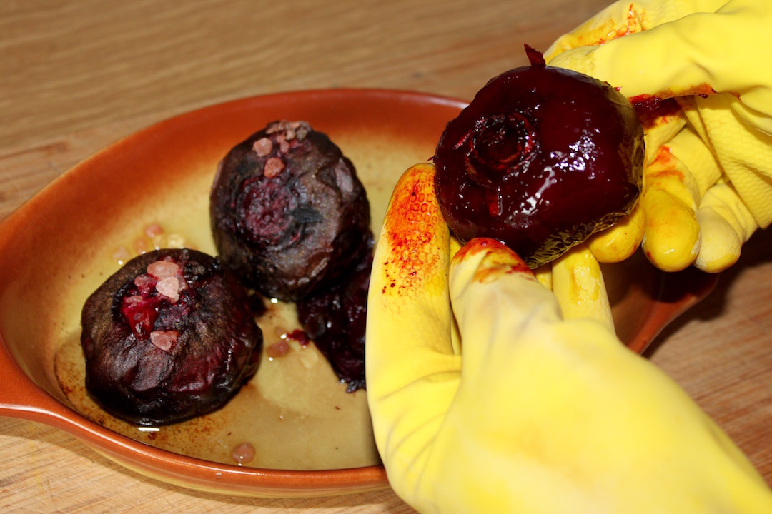 Przygotowanie buraczków: Odetnij buraczki od botwinki. Umyj je, osusz, przełóż do naczynia żaroodpornego, lekko posól i polej oliwą.