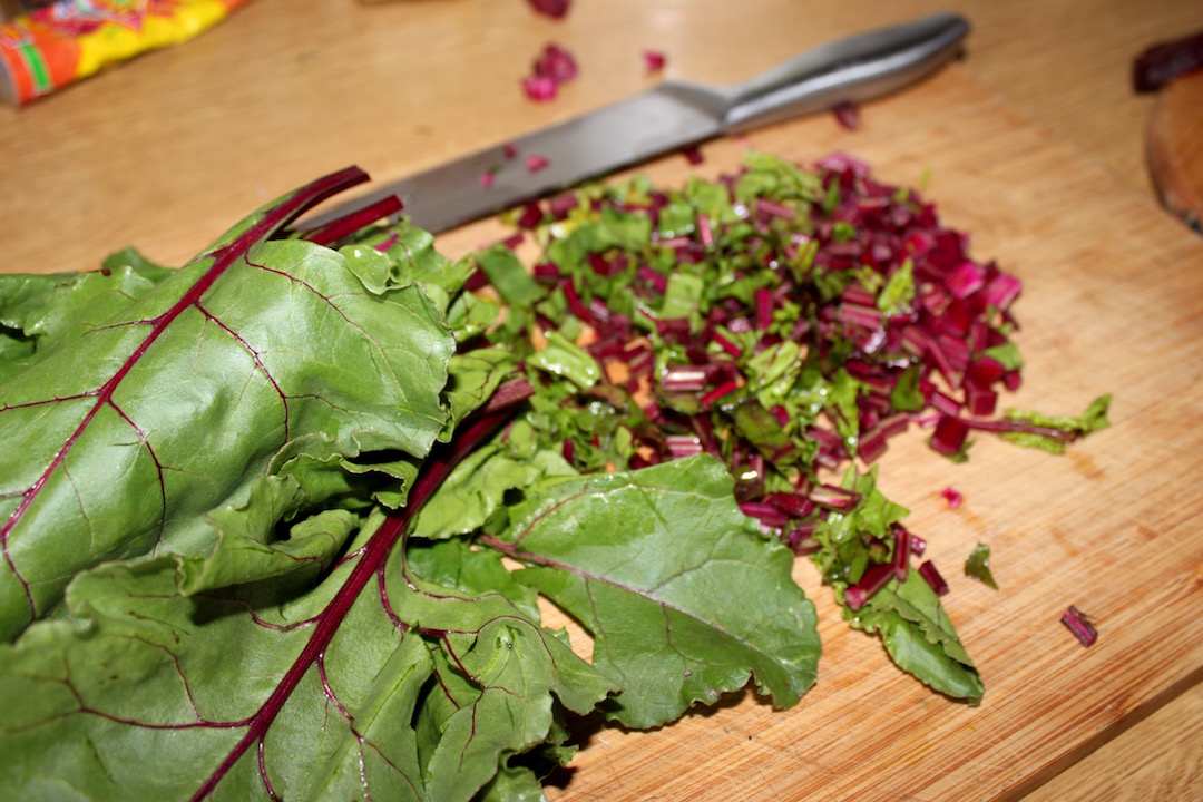 Smażenie: Na patelni rozgrzej niewielką ilość masła i wrzuć posiekane łodyżki botwinki. Smaż je około 2 minuty, mieszając.