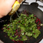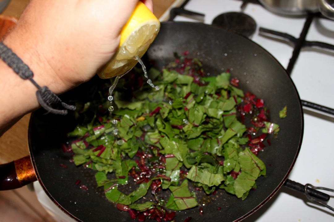 Dodanie liści i przypraw: Dodaj na patelnię liście botwinki i wyciśnij sok z połowy cytryny. Smaż całość kolejne 2 minuty.