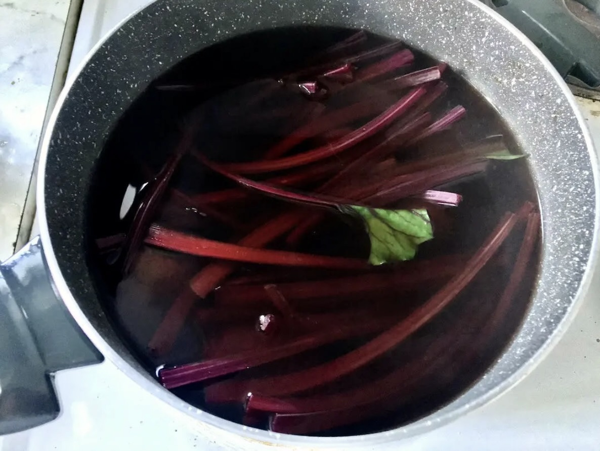 Gotowanie buraków: Do osolonej wody w garnku wrzuć oczyszczone buraczki i ich łodygi. Gotuj na średnim ogniu do miękkości buraczków (około 20 minut, w zależności od wielkości). Jeśli buraczki są duże, łodygi wrzuć mniej więcej w połowie gotowania.