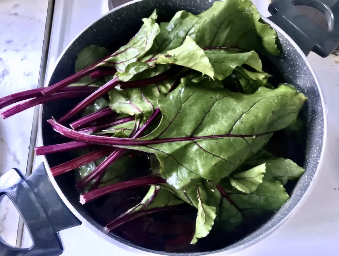 Gdy buraczki są miękkie, wrzuć do garnka liście botwinki. Gotuj wszystko przez kilka minut od ponownego zagotowania wody.