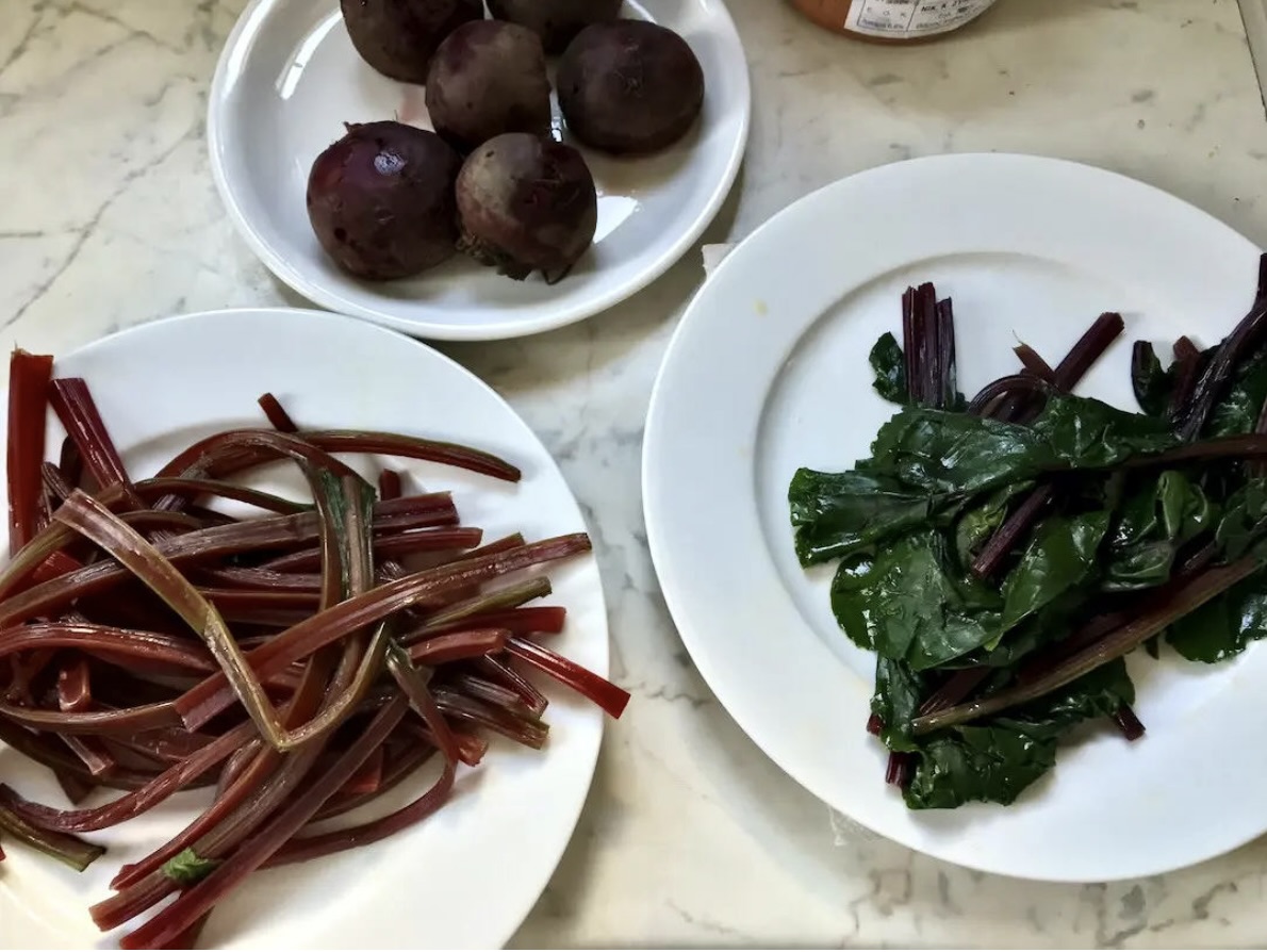 Przygotowanie botwinki: Podziel botwinkę na trzy części: buraczki, łodygi i liście.