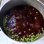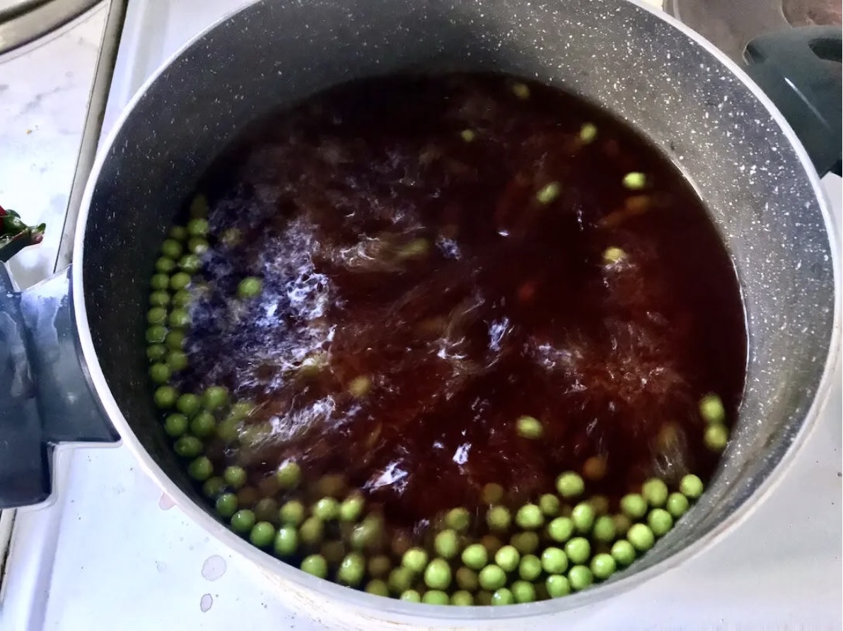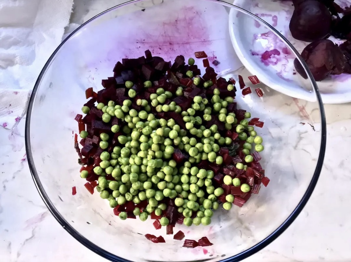 Gotowanie groszku: Wykorzystaj gorącą wodę, w której gotowały się buraki, i wrzuć do niej dwie garści groszku. Gotuj przez 10 minut, aż groszek będzie miękki.