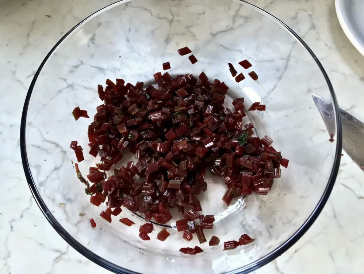 Składanie sałatki: Drobno posiekaj łodygi botwinki i przełóż do dużej miski.