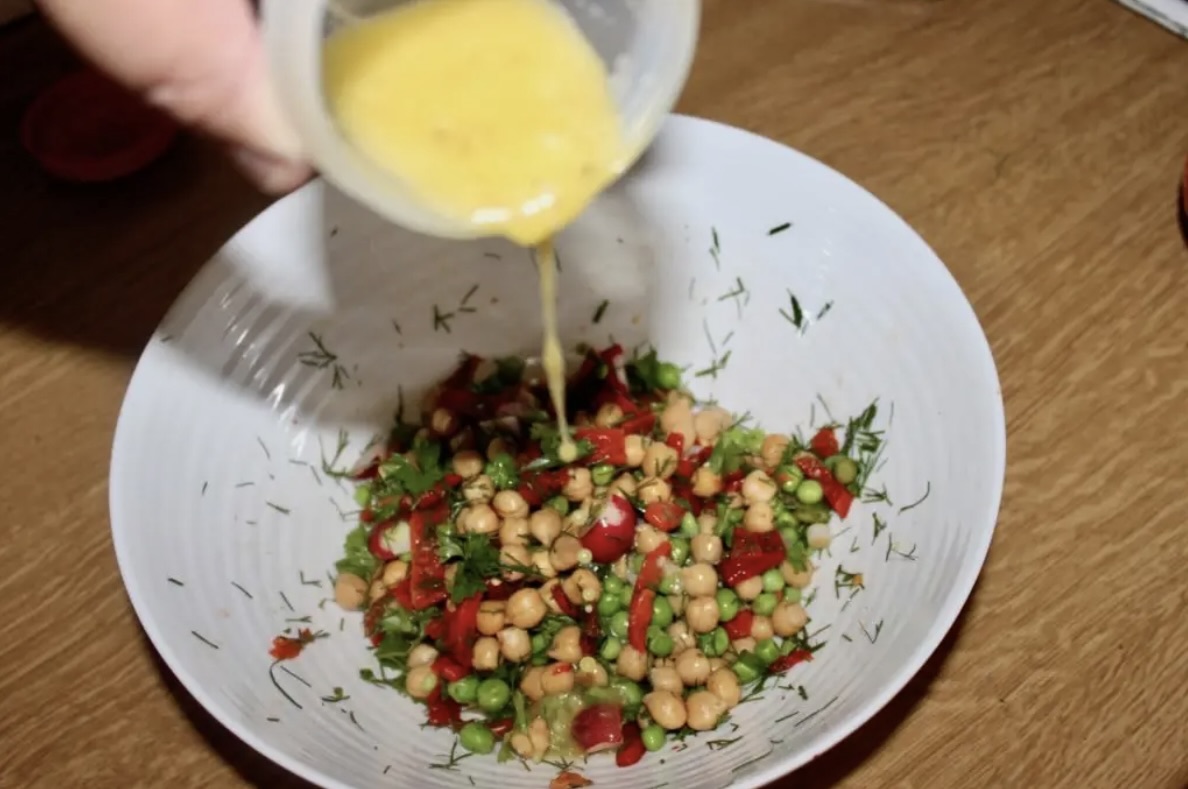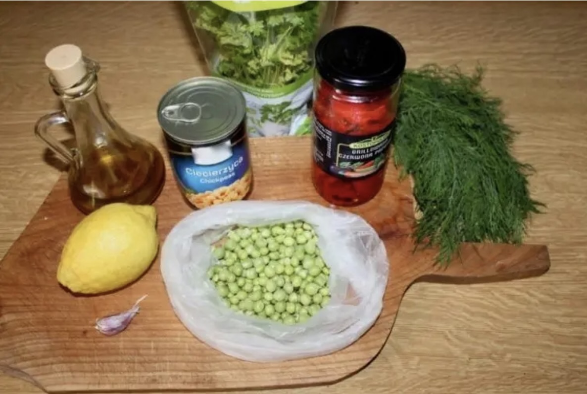 Łączenie składników: Do dużej miski wrzuć odciekniętą ciecierzycę i od razu po ugotowaniu i przelaniu zimną wodą – groszek.