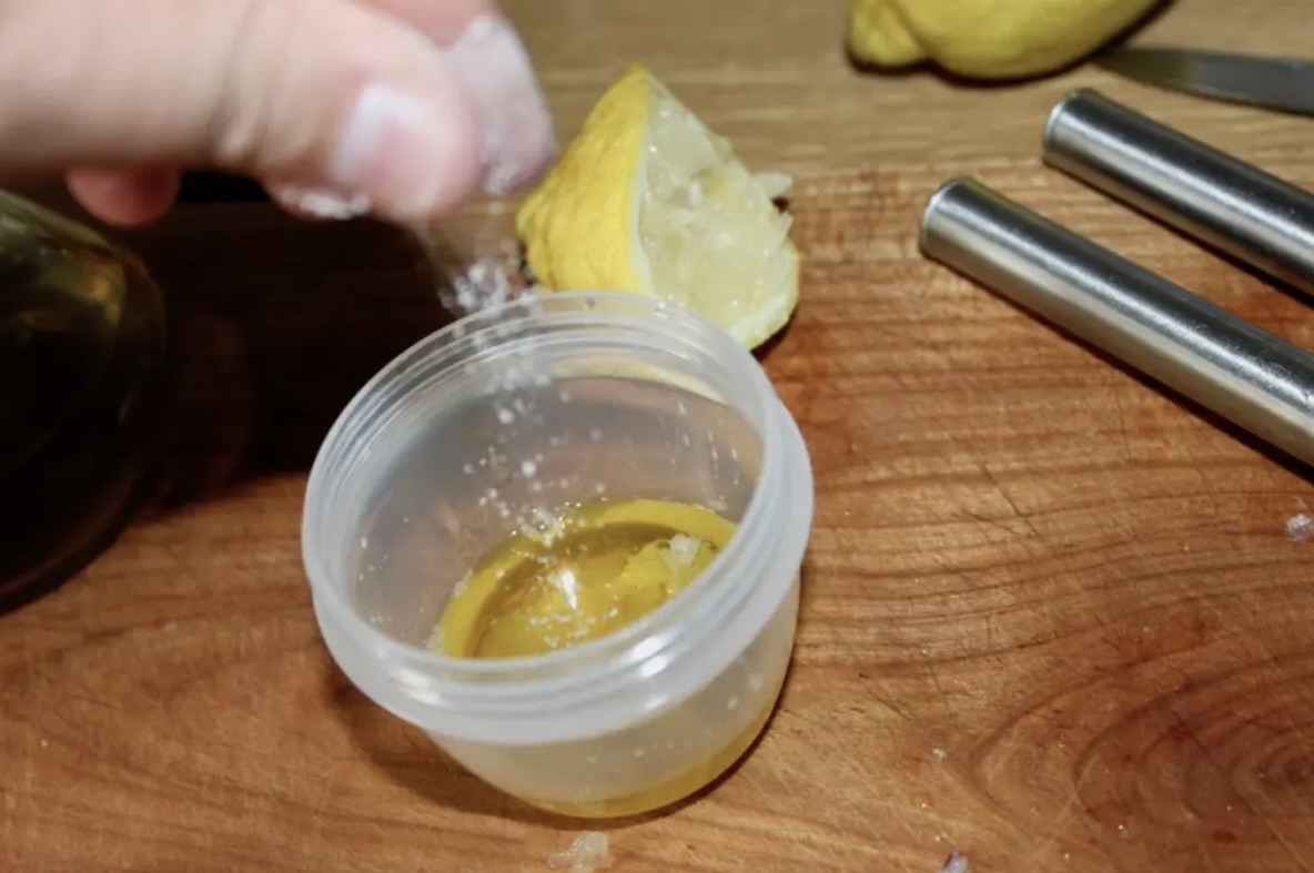 Sos winegret: Do małego pojemnika lub słoiczka wciśnij obrany ząbek czosnku. Wlej 3 łyżki oliwy extra vergine, a następnie świeżo wyciśnięty sok z połowy cytryny. Dodaj szczyptę soli i świeżo zmielonego pieprzu. Zakręć pojemnik i dobrze nim potrząsaj, aby powstała emulsja. Spróbuj i ewentualnie dopraw. Odstaw sos na bok.