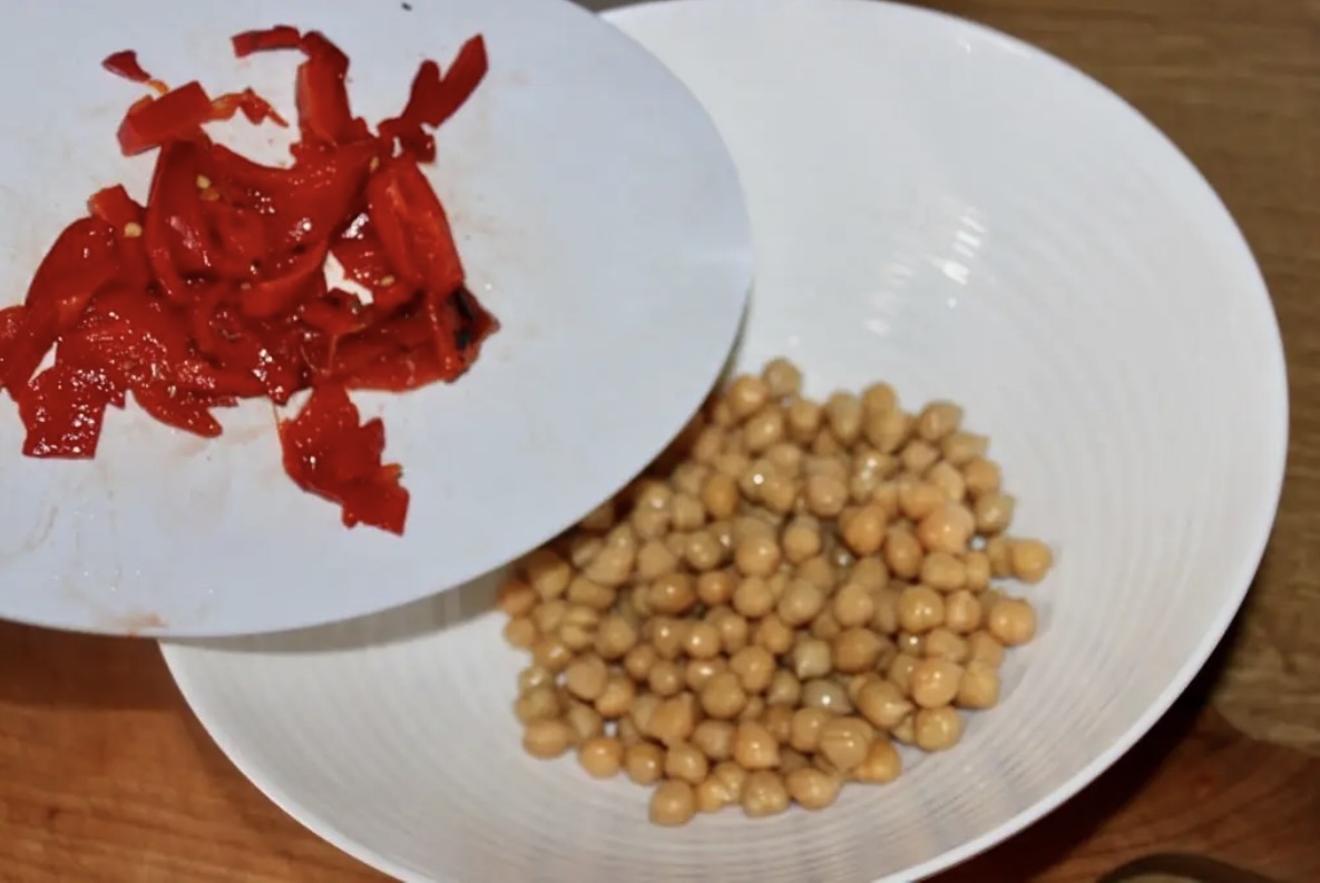 Ciecierzyca: Wyjmij ciecierzycę z puszki, opłucz pod bieżącą wodą i pozostaw na sitku, aby odciekła.
