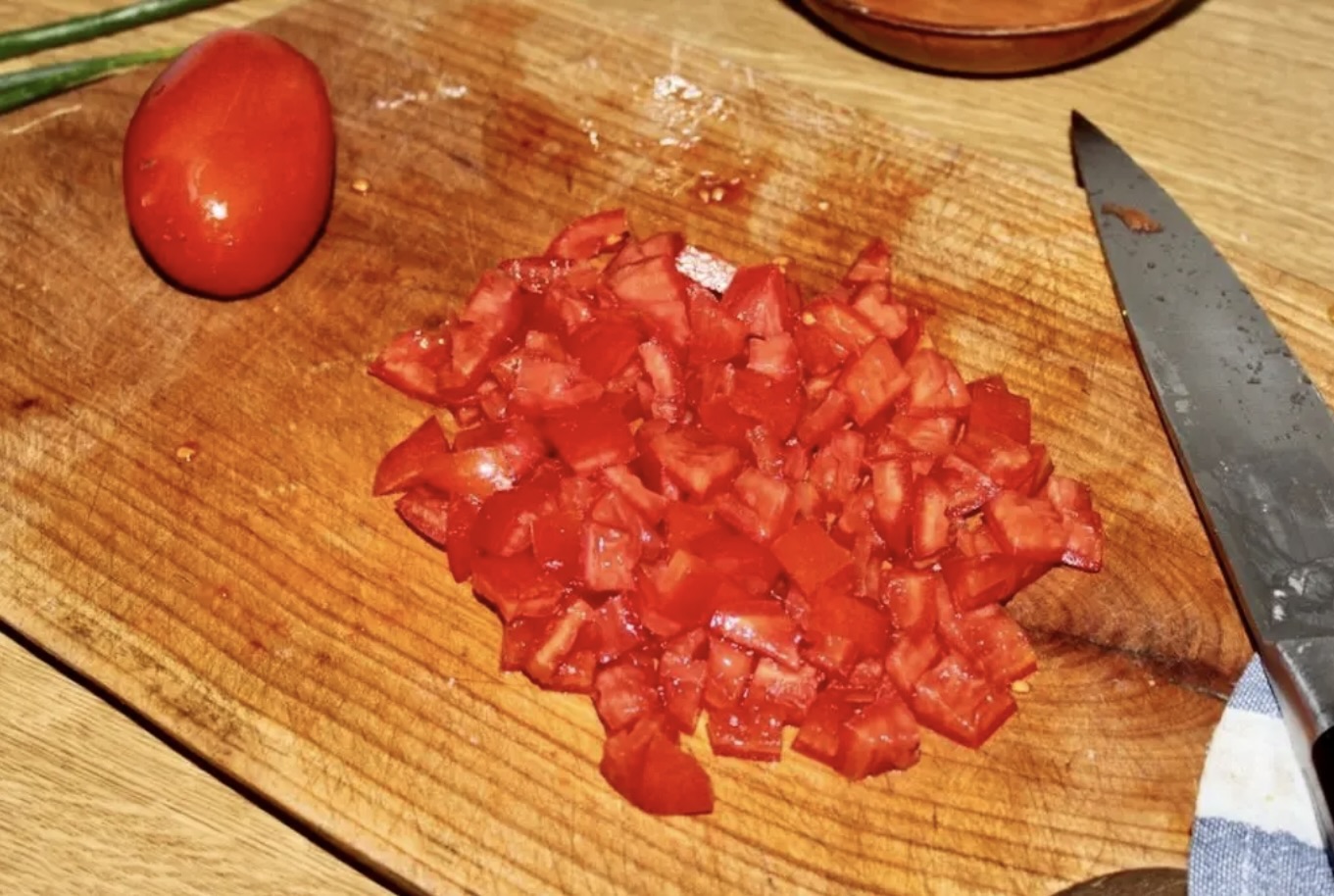 Pomidory umyj, osusz, przekrój na pół lub ćwiartki, a następnie usuń pestki. Jeśli wolisz, możesz też usunąć skórki. Pokrój w drobną kostkę.