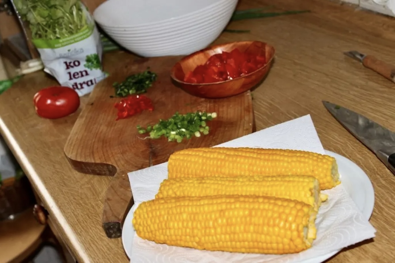 Jeśli używasz świeżej kukurydzy: obierz kolby z liści i „włosów”, odetnij końcówki. Ugotuj w dobrze osolonej wodzie (optymalny czas gotowania to 7-10 minut). Odcedź i ostudź (dowiedz się jak ugotować kukurydzę).