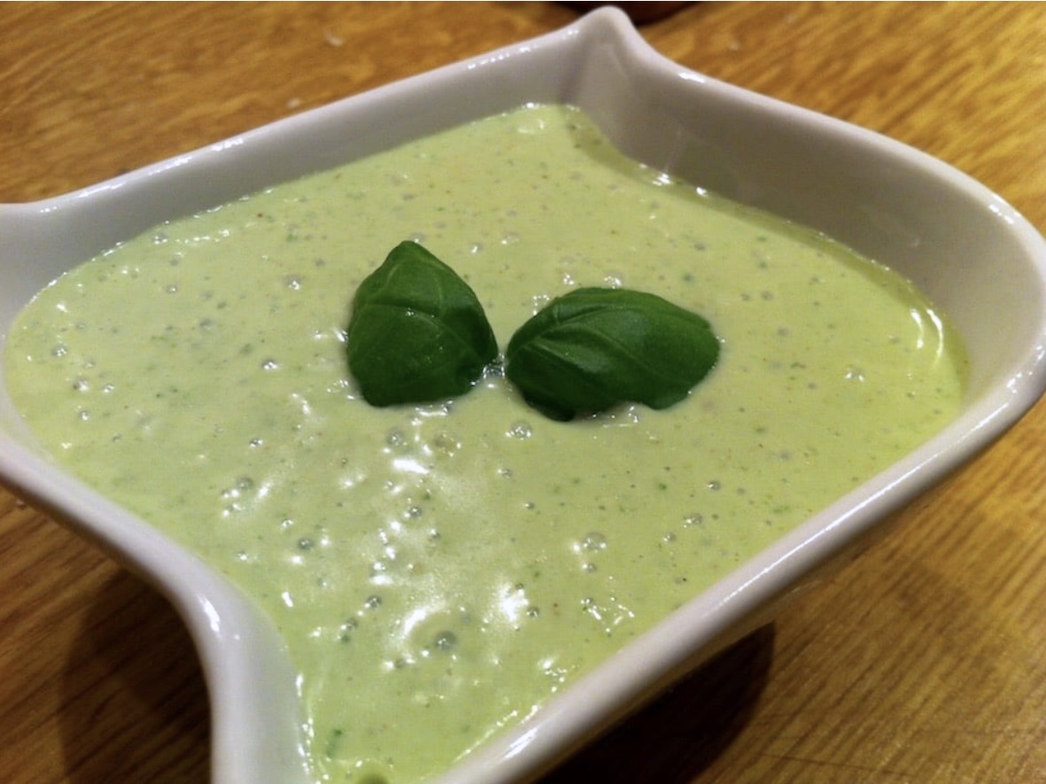Wszystkie składniki dressingu (jogurt, parmezan, bazylia, czosnek, musztarda, sok z cytryny, ostry sos, sól i pieprz) wrzuć do blendera.
