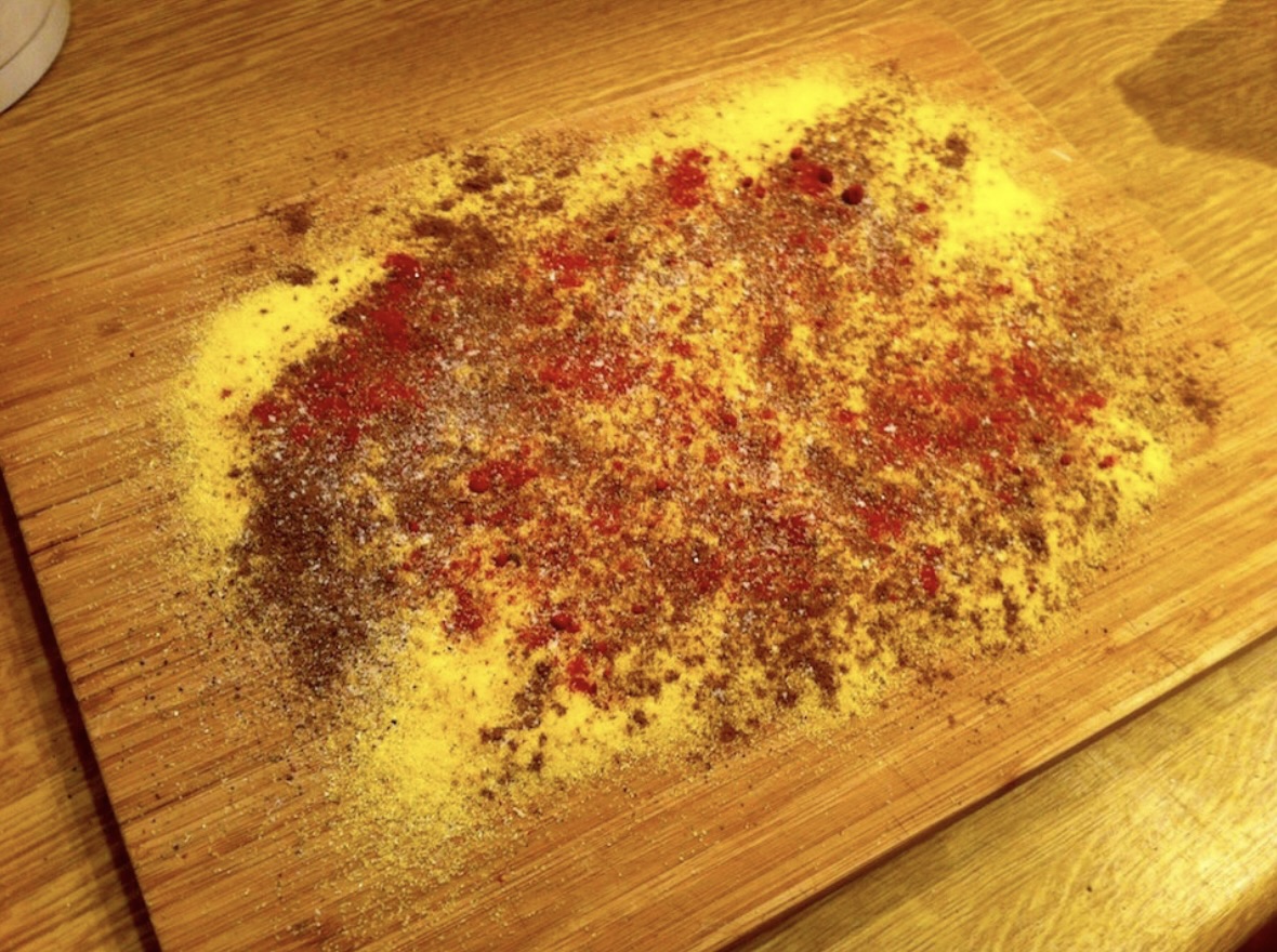 Na blacie rozsyp 3-4 łyżki kaszki kukurydzianej, trochę mielonej wędzonej papryki, mielonego ziela angielskiego, sól i pieprz.