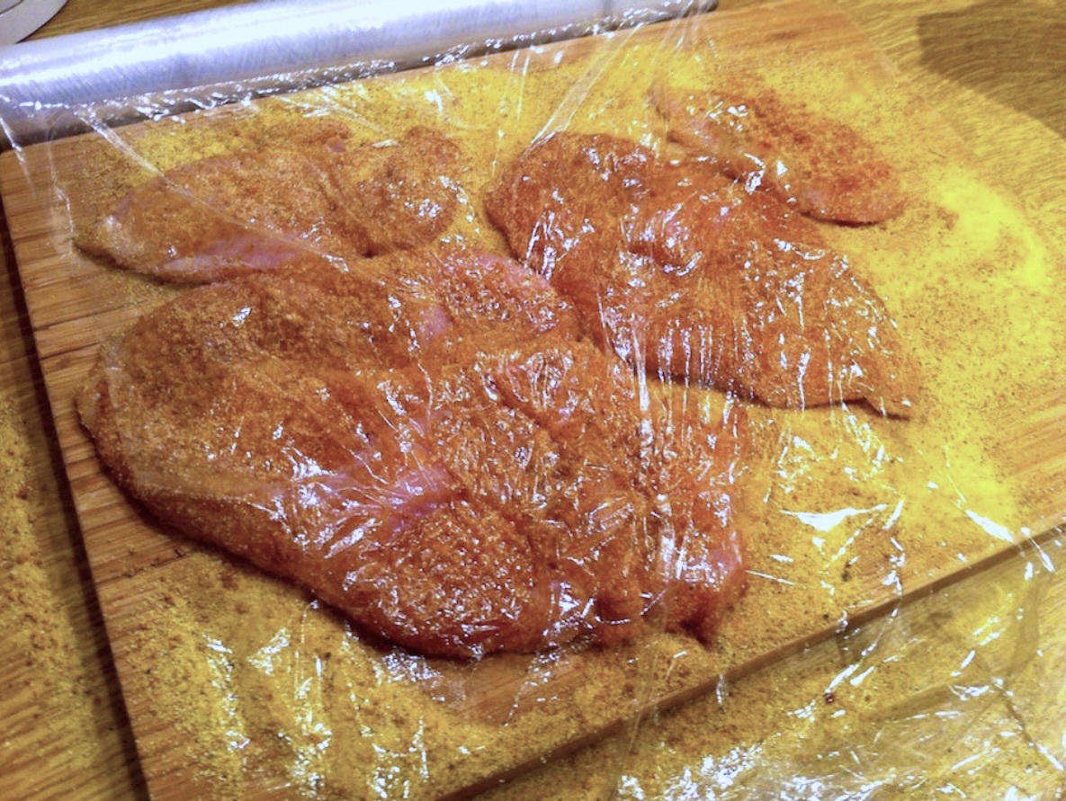 Rozłóż na tej mieszance 2 duże piersi z kurczaka, przykryj folią spożywczą, a następnie rozbij wałkiem do grubości około 1 cm, tak aby przyprawy wniknęły w mięso.