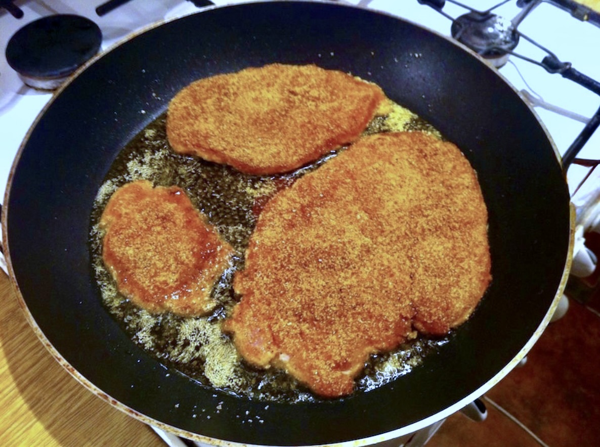 Na patelni rozgrzej nieco oliwy i smaż kurczaka na niezbyt mocnym ogniu, aż będzie chrupiący i gotowy.