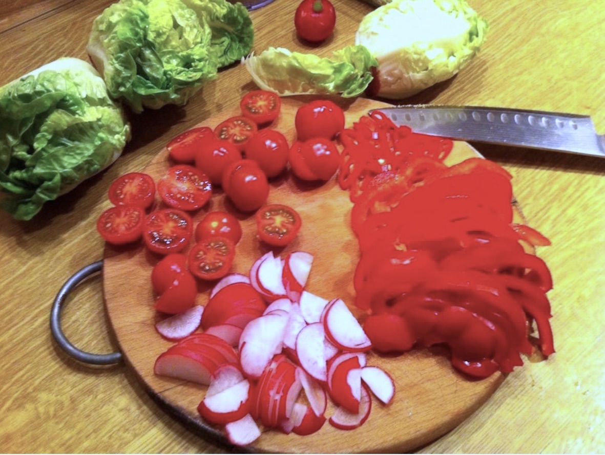 Warzywa: Umyj i osusz czerwoną paprykę, sałatę little gem, pomidorki koktajlowe oraz rzodkiewkę. Pokrój wszystkie warzywa według uznania.
