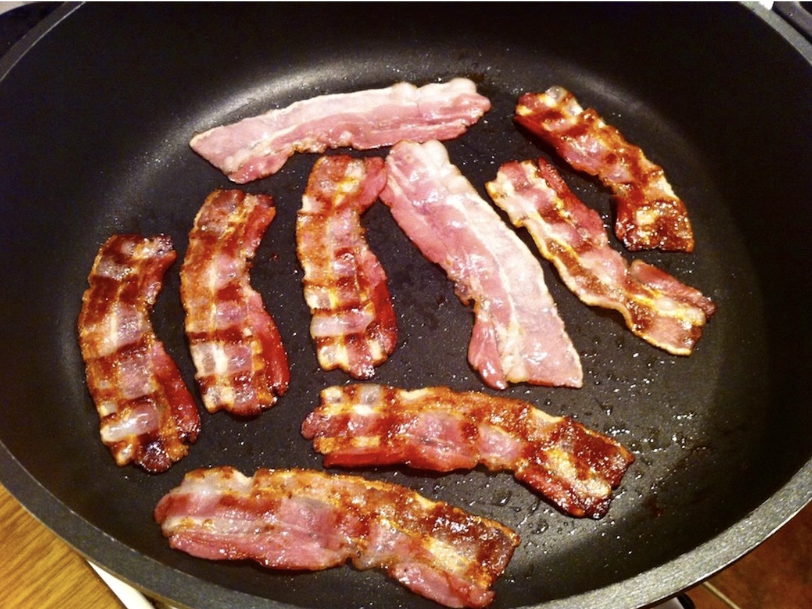 Boczek: Usmaż cieniutko pokrojone plasterki surowego, wędzonego boczku na chrupiąco.