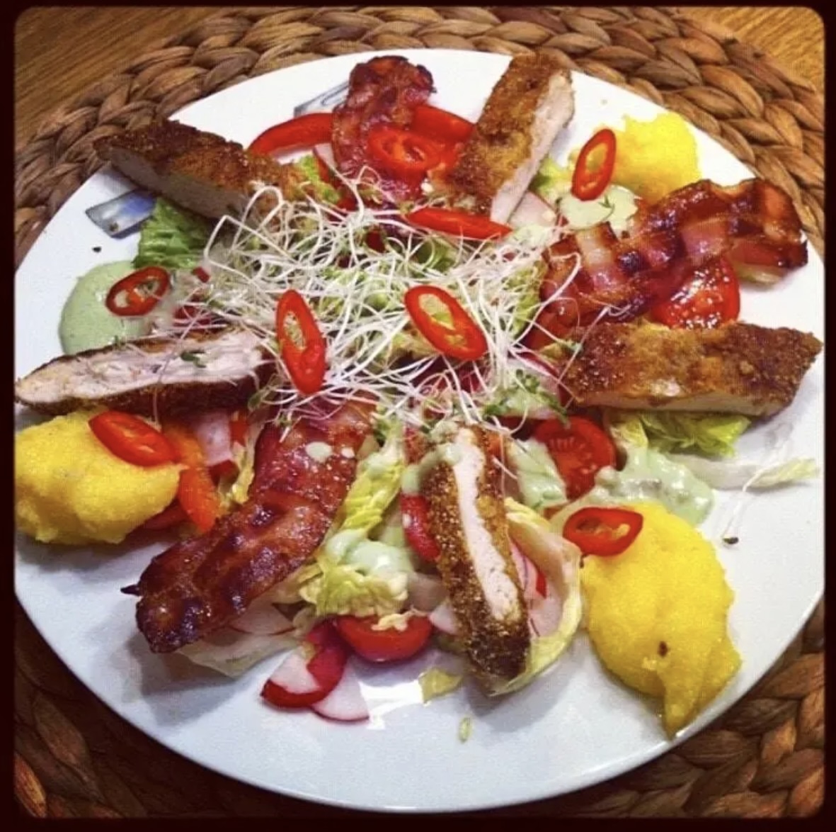 Smakowita sałatka z chrupiącym smażonym kurczakiem, podana z warzywami i polentą oraz z dressingiem o smaku bazylii. Generalnie sałatka z kurczakiem jest popularnym daniem w Polsce. Ale przecież nie tylko w naszym kraju chętnie jada się sałatki, w których pierwsze skrzypce gra kurczak. Jedną z najbardziej znanych takich sałatek jest sałatka Cezar. I to właśnie ta sałatka z kurczakiem było moim pierwowzorem do stworzenia swojej własnej, na którą przepis poniżej Wam przedstawiam. Jest to całkiem luźna wariacja na temat sałatki z kurczaka w ogóle. Ważne, że wyszło pysznie, a sałatka na stałe znalazła się w moim menu. Mam nadzieję, że podobnie będzie u Was.
