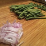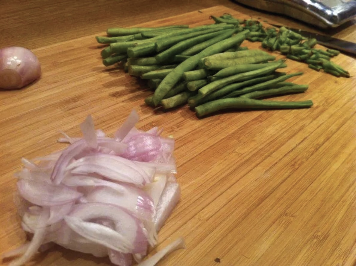 Przygotowanie warzyw: Poszatkuj szalotkę i oczyść fasolkę szparagową.