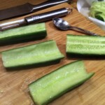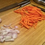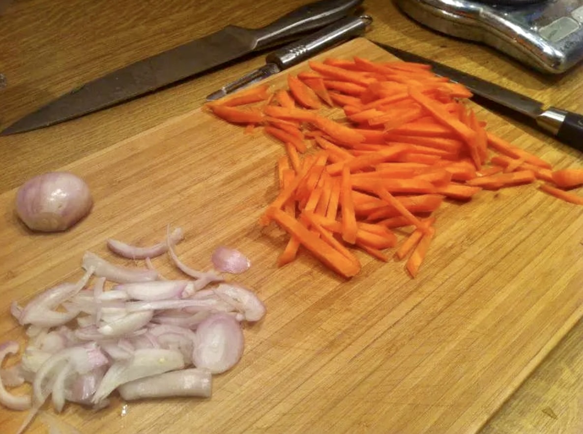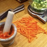Krojenie marchewki i ogórka: Marchewkę pokrój w słupki (julienne). Ogórka umyj, osusz, przekrój wzdłuż, usuń nasiona i pokrój w nieduże kawałki.