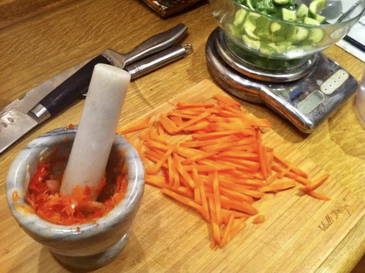 Przygotowanie sosu: Do moździerza wrzuć posiekaną szalotkę i papryczkę chilli. Dodaj 3 łyżki octu ryżowego i 1 łyżkę brązowego cukru. Całość dokładnie utrzyj.