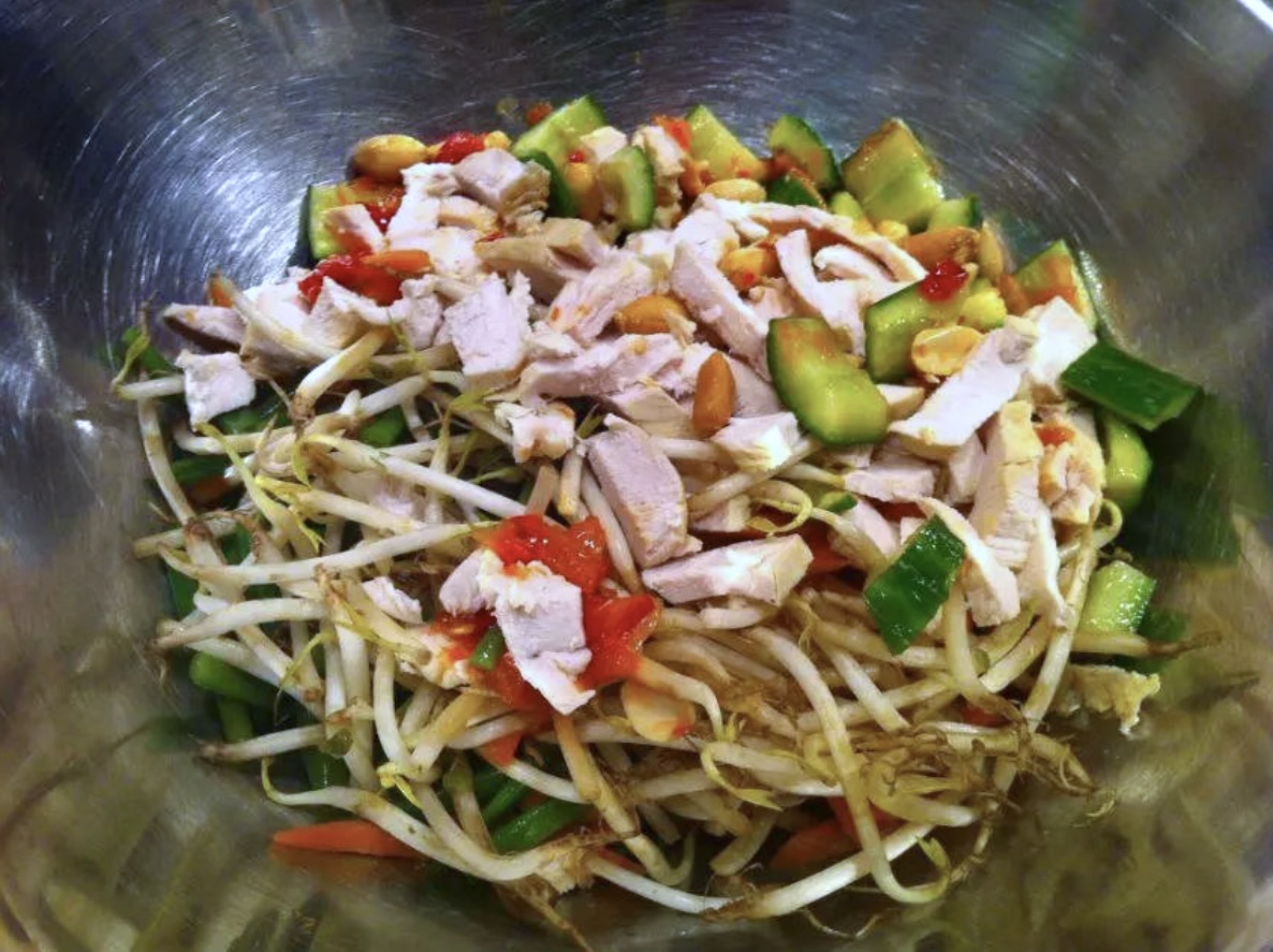 Łączenie: Do miski wrzuć pokrojoną marchewkę, fasolkę szparagową, ogórka i kurczaka. Dodaj kiełki fasoli i uprażone wcześniej orzechy pistacjowe (według uznania).