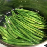 Blanszowanie fasolki: Fasolkę wrzuć na wrzątek, zagotuj, po 2 minutach wyjmij i przelej zimną wodą. Odłóż na bok. Następnie pokrój ją na 3-centymetrowe kawałki.