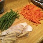 Przygotowanie kurczaka: Ugotowaną pierś z kurczaka (autor poleca gotować w bulionie z dodatkiem startego imbiru i mleczka kokosowego) pokrój w plastry.