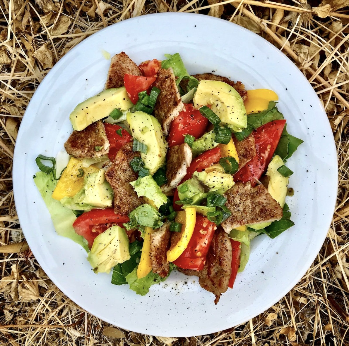 Sałatka z polędwiczką wieprzową z dodatkiem sycących warzyw z pewnością nie jest sałatką typu light. Ale kto powiedział, że sałatki muszą składać się jedynie z papieru i powietrza. Najlepszym przykładem sycącej sałatki jest słynna caprese. Również i moja sałatka z polędwiczką wieprzową jest sałatką sycącą. Oprócz delikatnego mięsa są w niej również warzywa, m.in. awokado, które również porządnie syci. Moim zadaniem to idealna sałatka na koniec lata, kiedy warzywa wciąż są pyszne i dojrzałe, a nam potrzeba już nieco więcej kalorii do życia niż w środku lata.