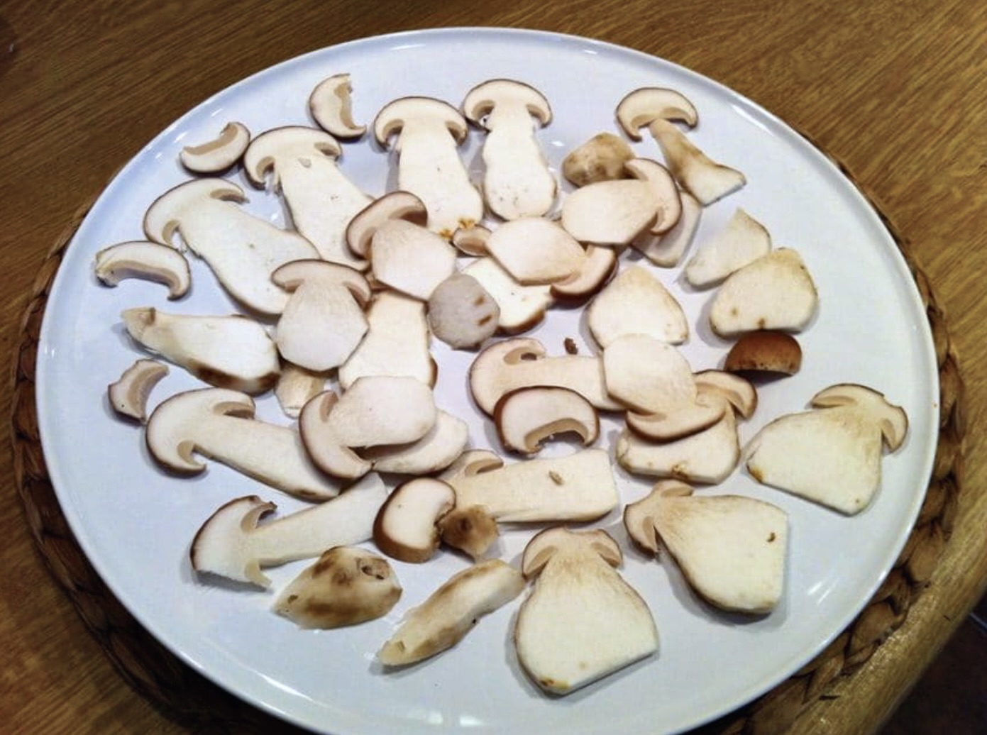 Krojenie: Używając bardzo ostrego noża, pokrój grzyby wzdłuż w dość cienkie plasterki, zachowując ich kształt (nie siekaj ich w kostkę). Ostry nóż zapobiegnie zmiażdżeniu delikatnej struktury grzyba.