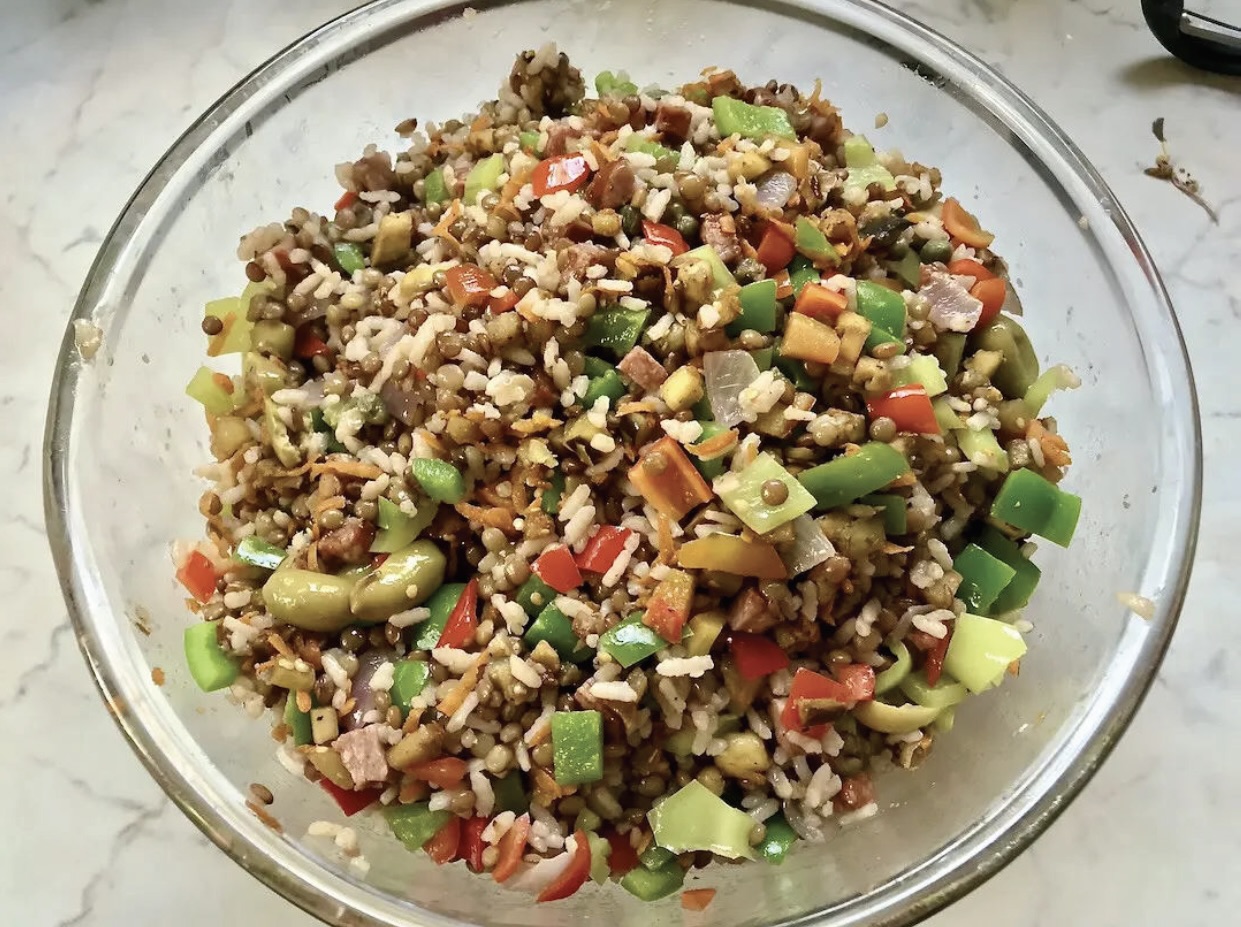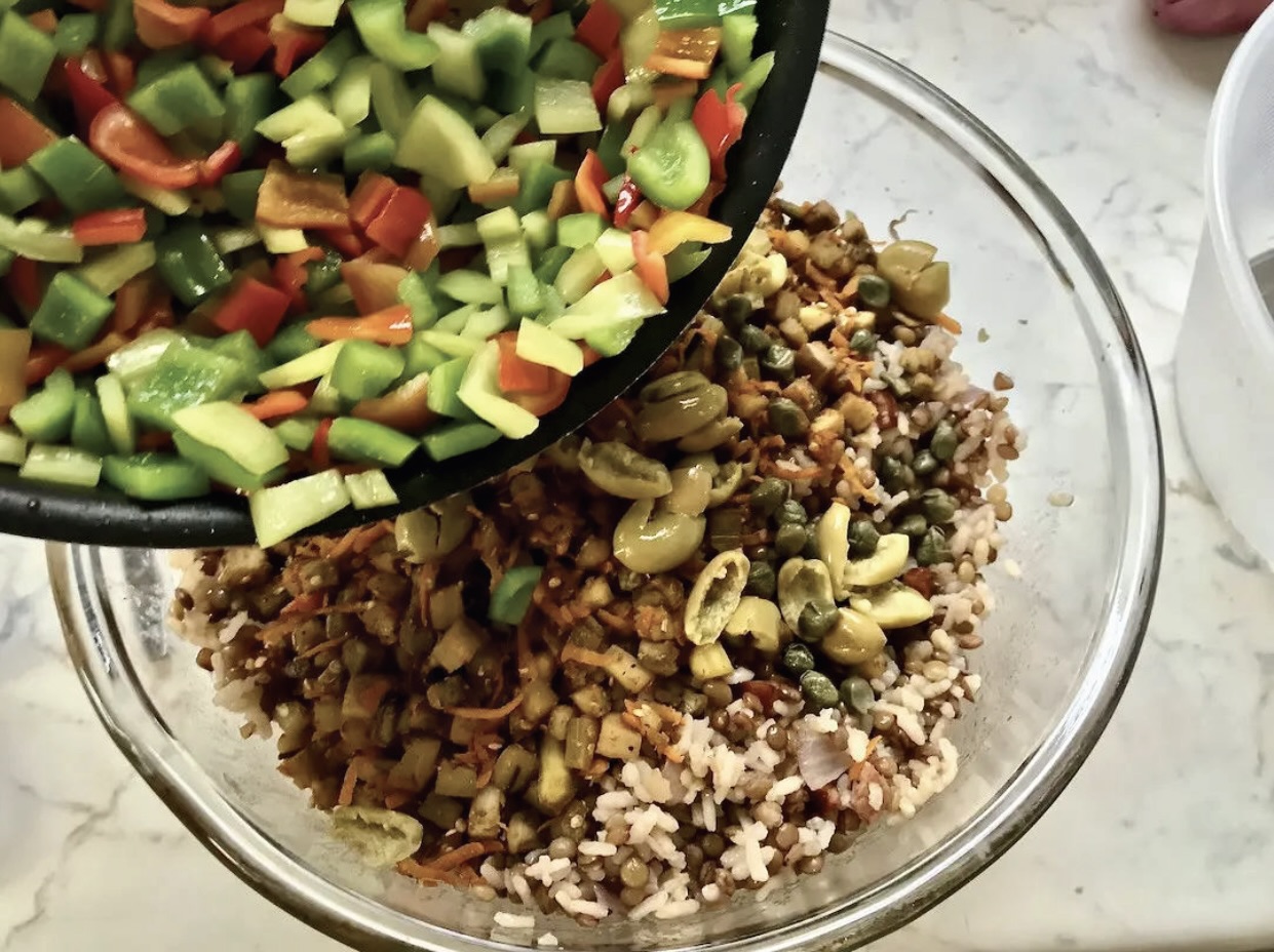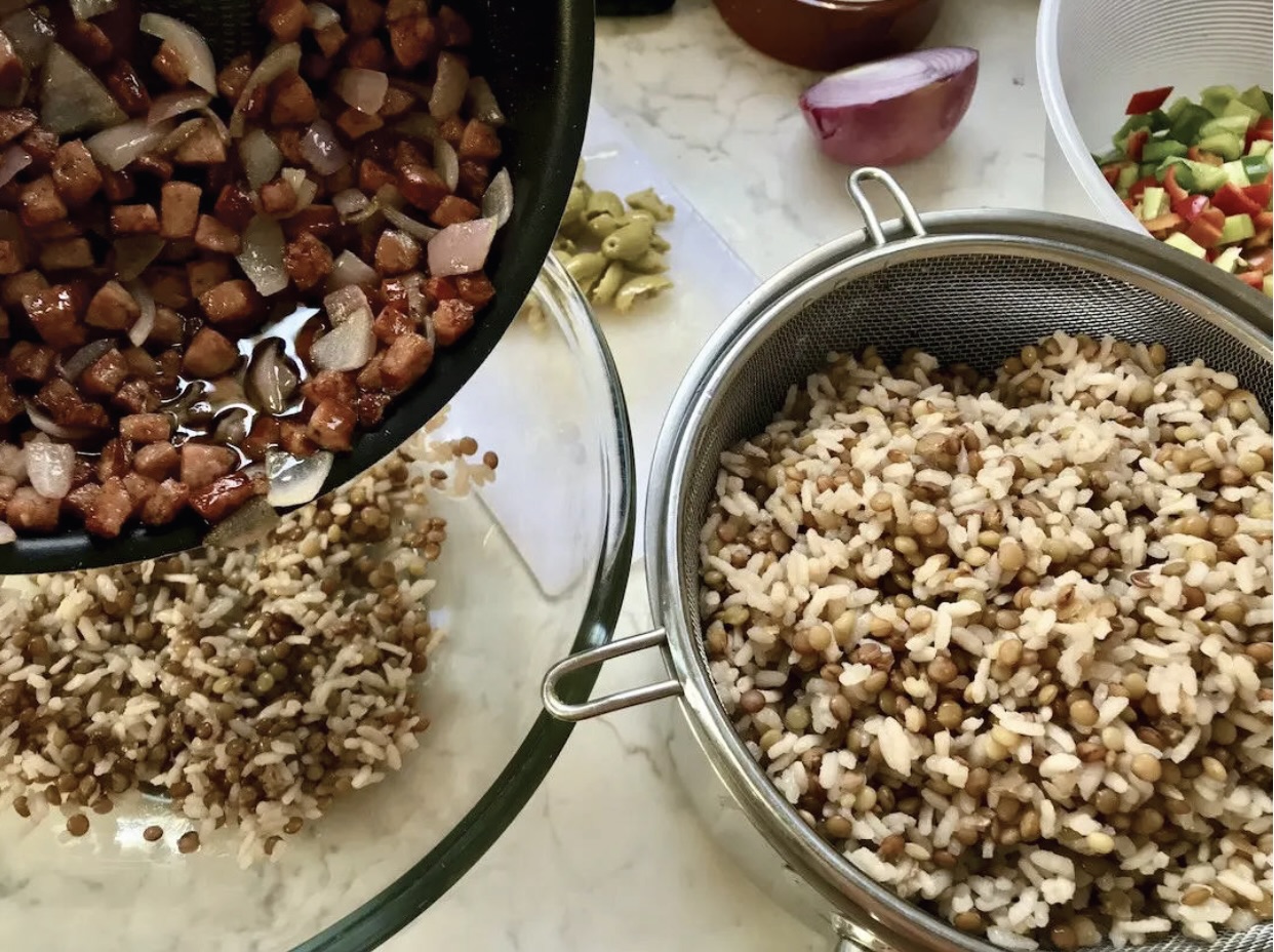 Przesmażoną kiełbasę z cebulą dorzuć do miski z lekko przestudzonymi soczewicą i ryżem.