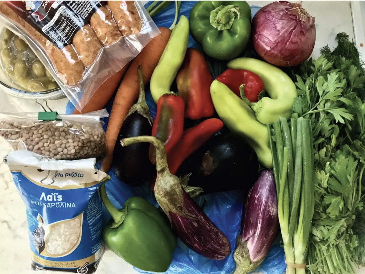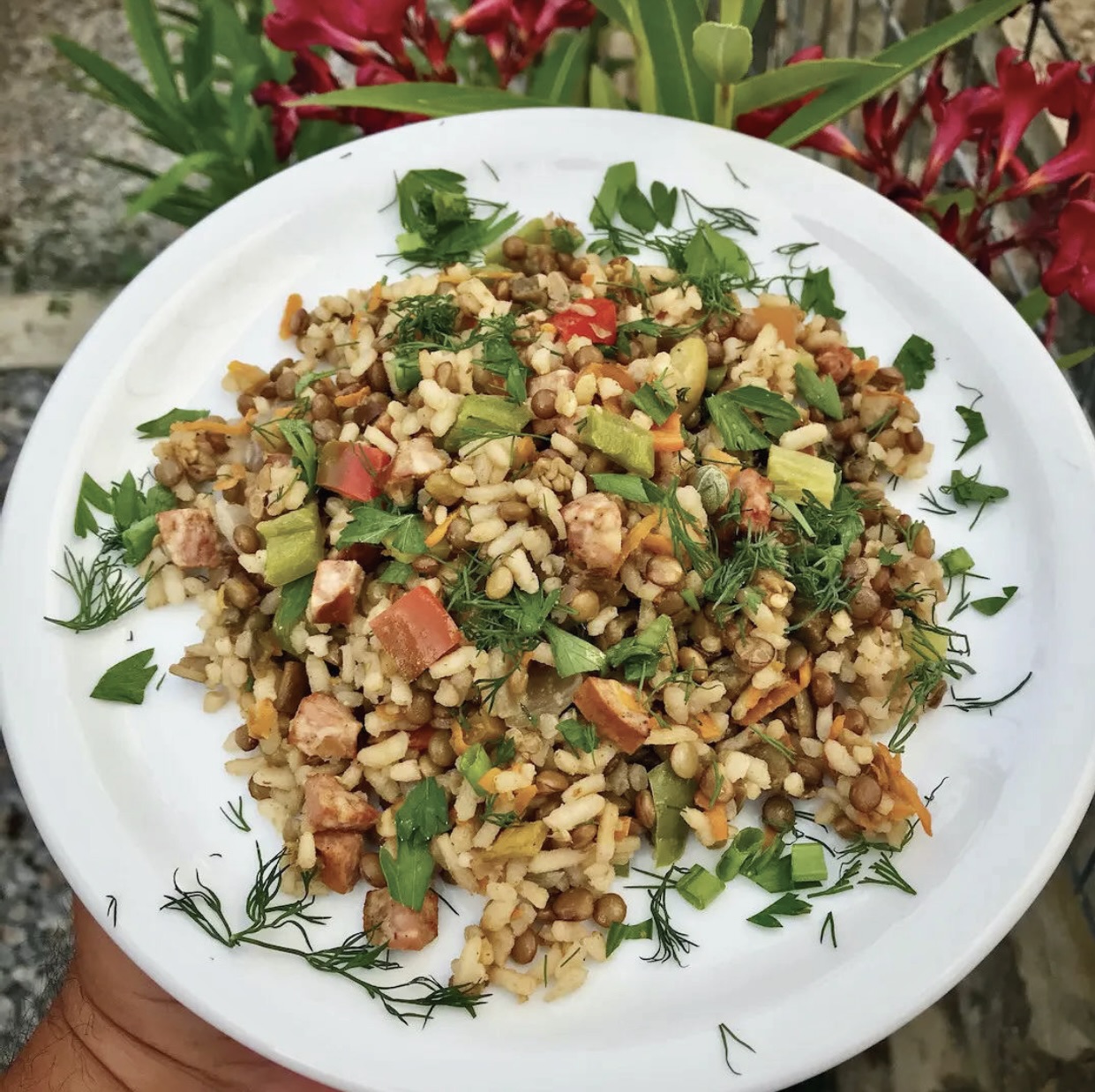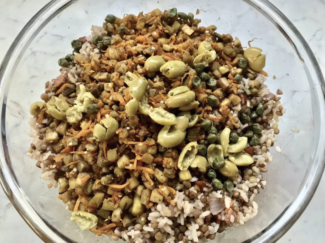 Przesmażoną kiełbasę z cebulą dorzuć do miski z lekko przestudzonymi soczewicą i ryżem.