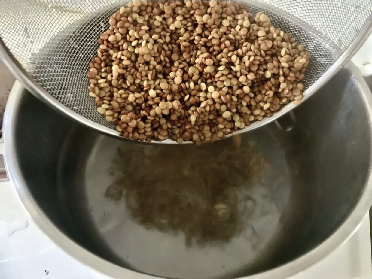 Opłucz soczewicę pod bieżącą wodą, a następnie wrzuć ją do garnka z gotującą się, nieosoloną wodą.